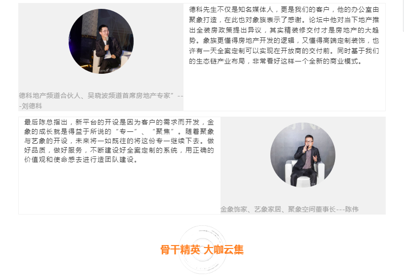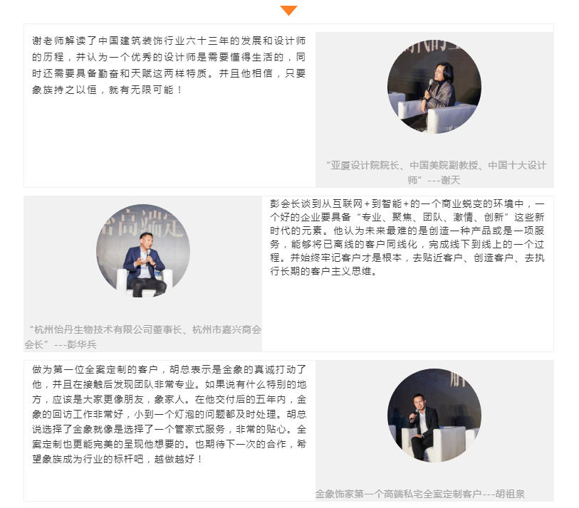 现场,陈总分别对客户、合作伙伴、帮助过象族的朋友们表达了感谢之情,感谢一直以来对象族的信任与支持,感谢一路以来的风雨同行;同时,也对公司合伙人表达了真挚的谢意。并借由今天两大全新服务平台——“艺象家居”和“聚象空间”的正式发布,提供纯软装品类和非住宅品类的高品质全案定制精装服务,在未来能够满足更多客户朋友在高端定制精装方面的个性化需求。