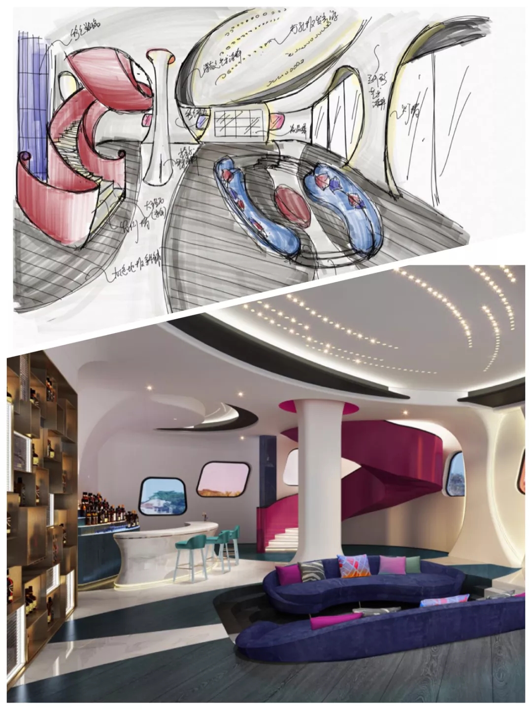 借用山庄的郁郁葱葱,表达人、建筑与自然的融合,以自然的四季提色,用风、空气、水之形,在室内融合生命之能量,通过老建筑的记忆表达,带来全新的五感享受。期间,树叶之纹理、风之流动形态的表现,水的波光粼粼产生的汇合倒影,再加之色彩斑斓的自然涂绘,给空间中的人带来视觉冲击的同时更加自然的感受老建筑把外景内置带来的心的表诉。描绘出山林舒展带香来,风揉朴宅敞心怀,花间寻得一壶酒,卧倒石头寻梦游的逍遥画面。