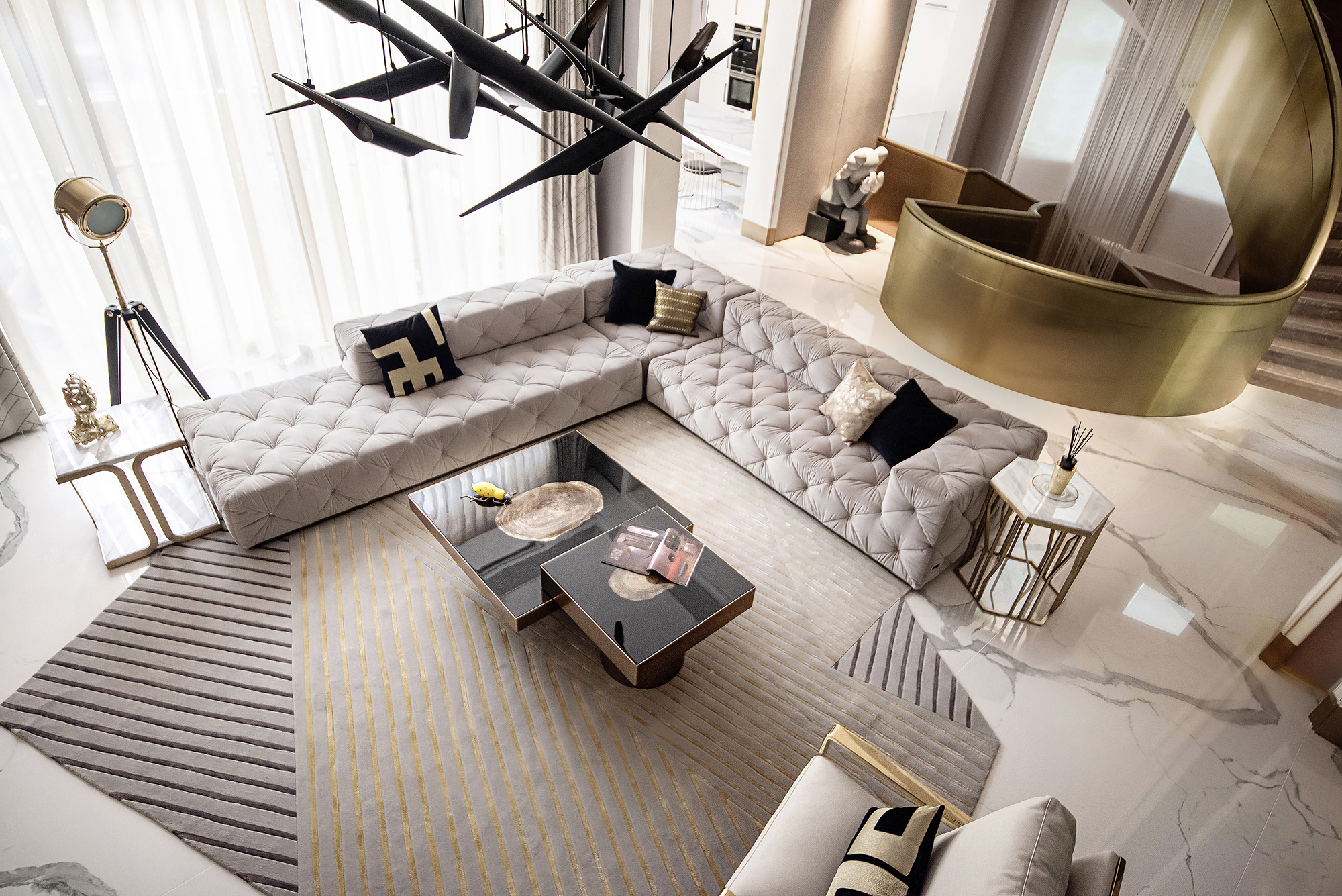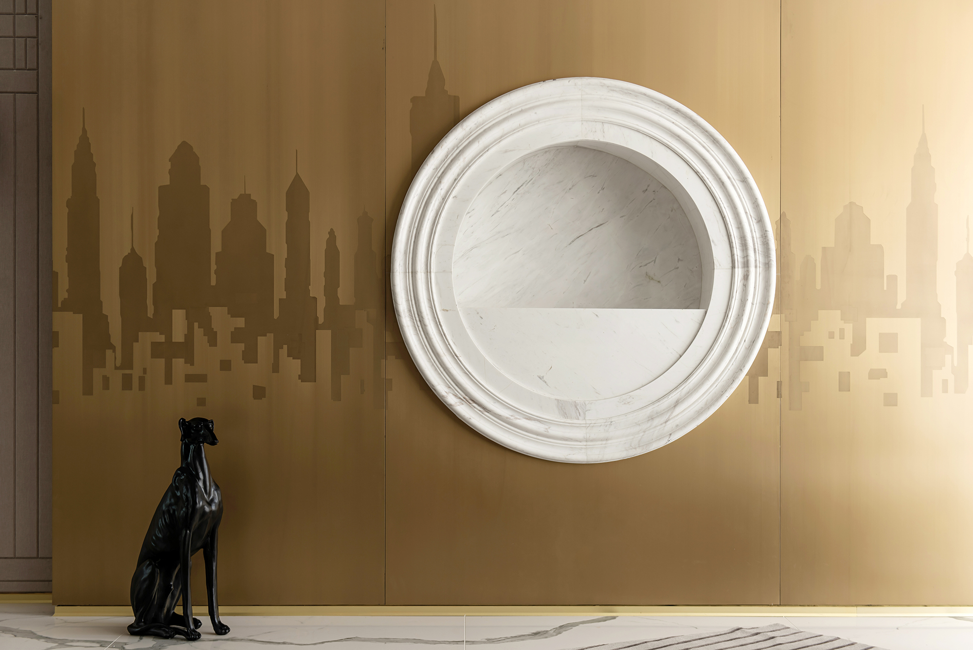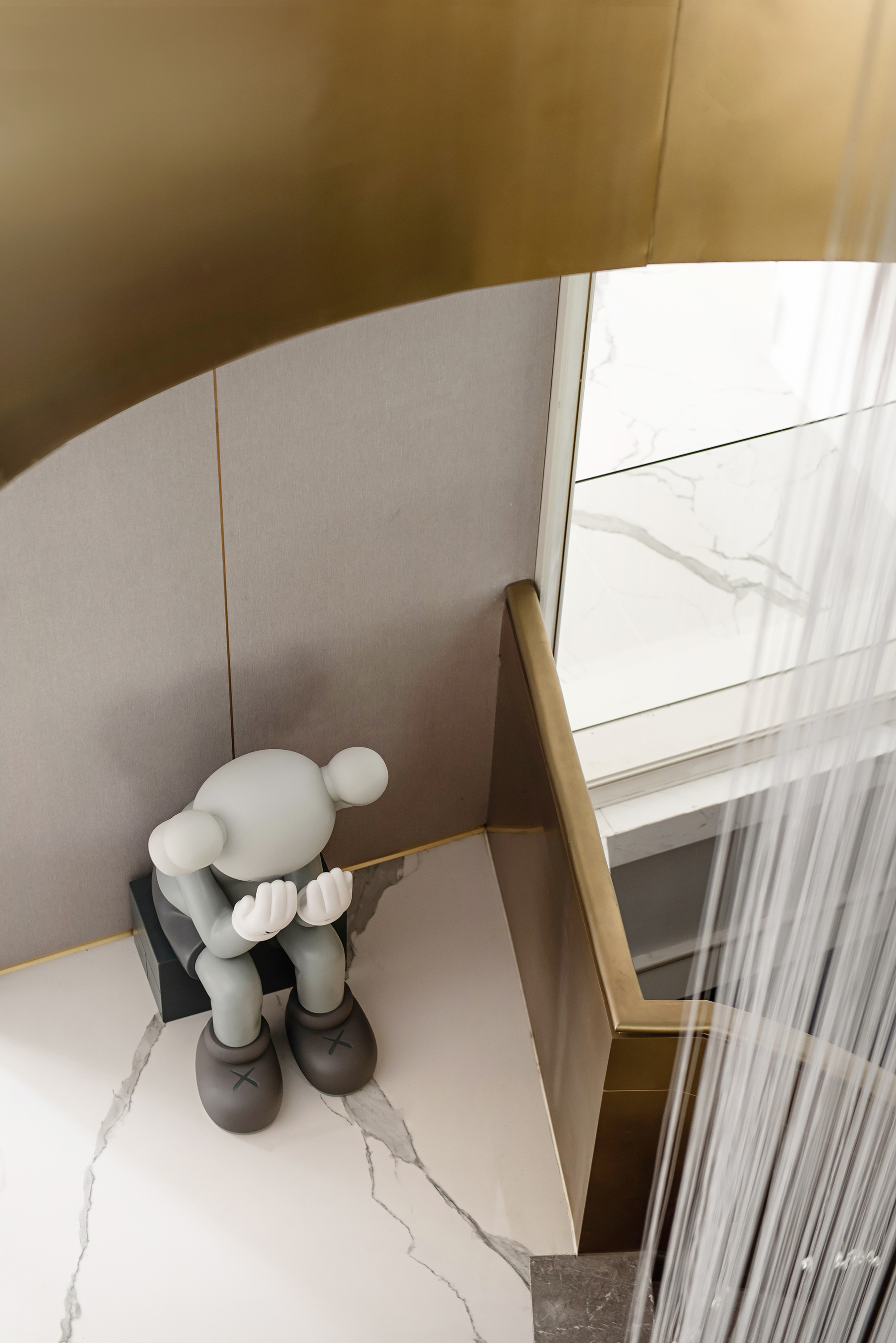 受过良好教育的上层社会人士,并承载着整个家族的传承使命,对永恒的设计有着自己独特的见解,即有狂野的一面,也懂得享受生活。设计师将人物气质与空间气质完美融合,定调为一个拥有着独特品味与绅士格调的时尚男士之家。风格上汲取《了不起的盖茨比》中的经典Art deco装饰风格,结合电影《50度灰》中的现代主义表现手法进而混搭成作。空间内贯穿使用几何麦穗元素,大理石与铜质金属材质相佐,色彩定调以高级感的冷色系黑、金、灰、白四色为主线,演绎空间的视觉美感,看似简单却蕴含着极具品位的隐藏式贵族气质,展现了主人别致而时尚的品味,低调内敛却光芒万丈。