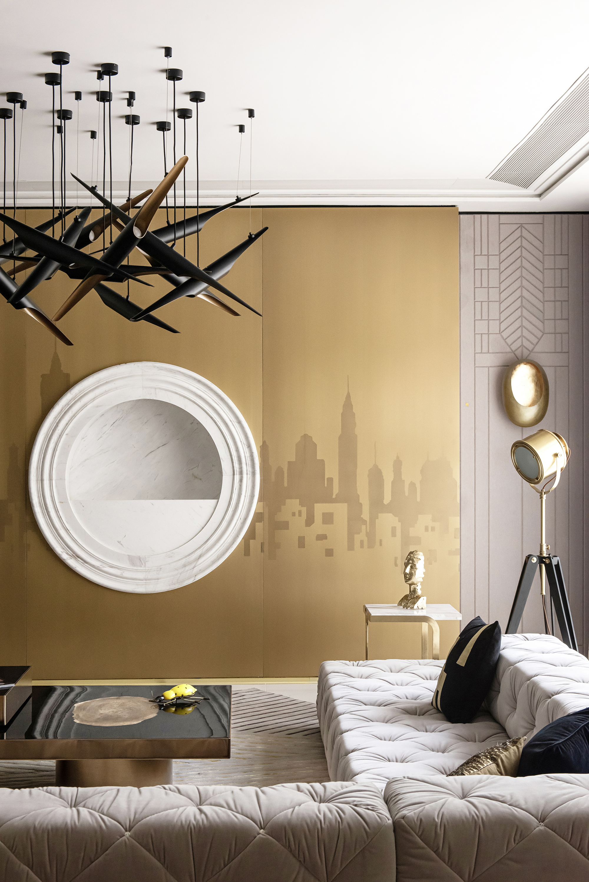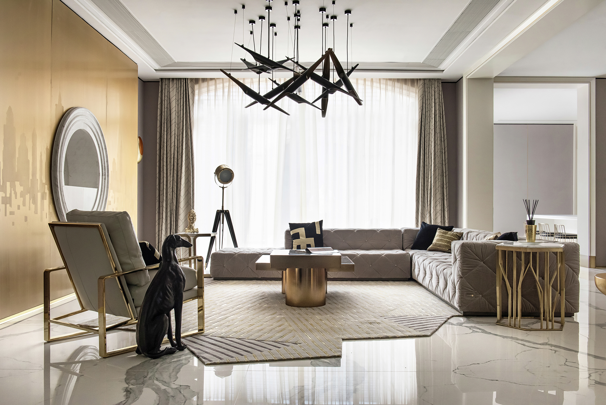 The well-educated upper class, bearing the mission of the whole family, have their own unique views on the eternal design, that is, they have a wild side and know how to enjoy life. The designer combines the character temperament with the space temperament, and sets the tone for a fashionable men's home with unique taste and gentleman style. In terms of style, it absorbs the classic Art Deco decoration in the Great Gatsby, and combines the modernist expression techniques in the film "50 degrees gray". The space is permeated with geometric lines, wheat ear elements, marble and copper metal materials. The color setting takes advanced cold color black gold and gray as the main line to deduce the visual beauty of the space. It seems simple but contains hidden noble temperament with high grade, showing the owner's unique and fashionable taste, low-key and luxurious.