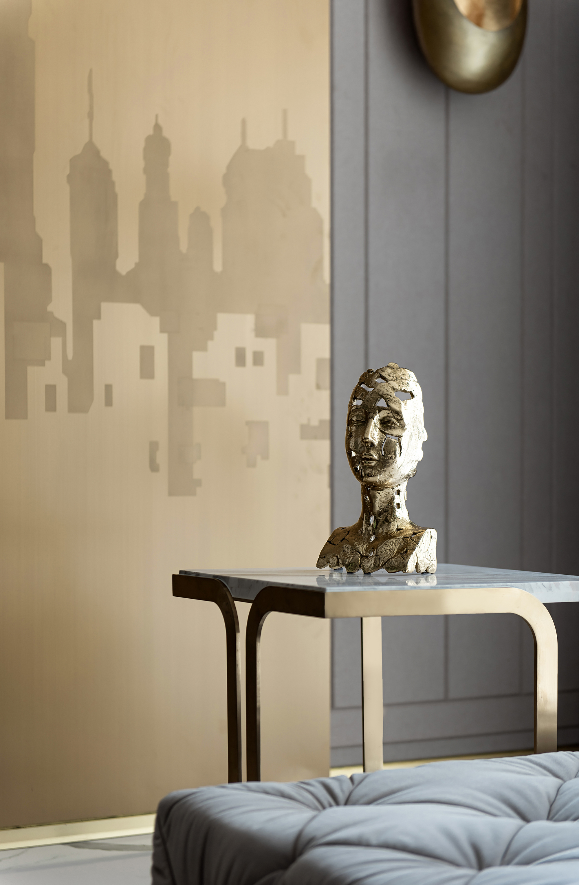 壁炉镶嵌的背景铜板墙,采用腐蚀浮刻工艺雕刻做出的城市剪影效果,整个空间是男主人未来纵观天下之事,胸怀天下之气度的精神意念,谈笑有盈、宠辱不惊,赋予家族传承精神的内在定义。