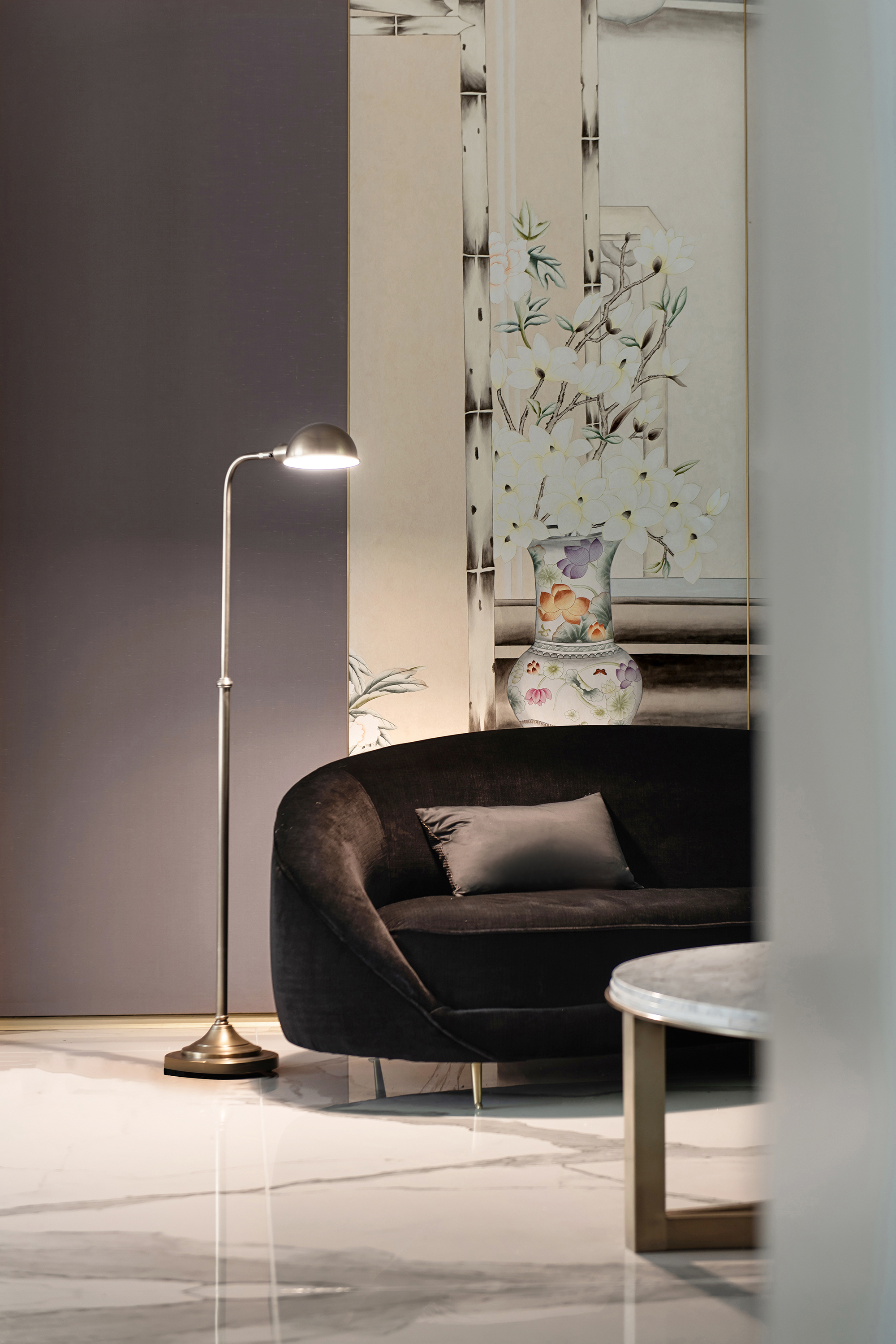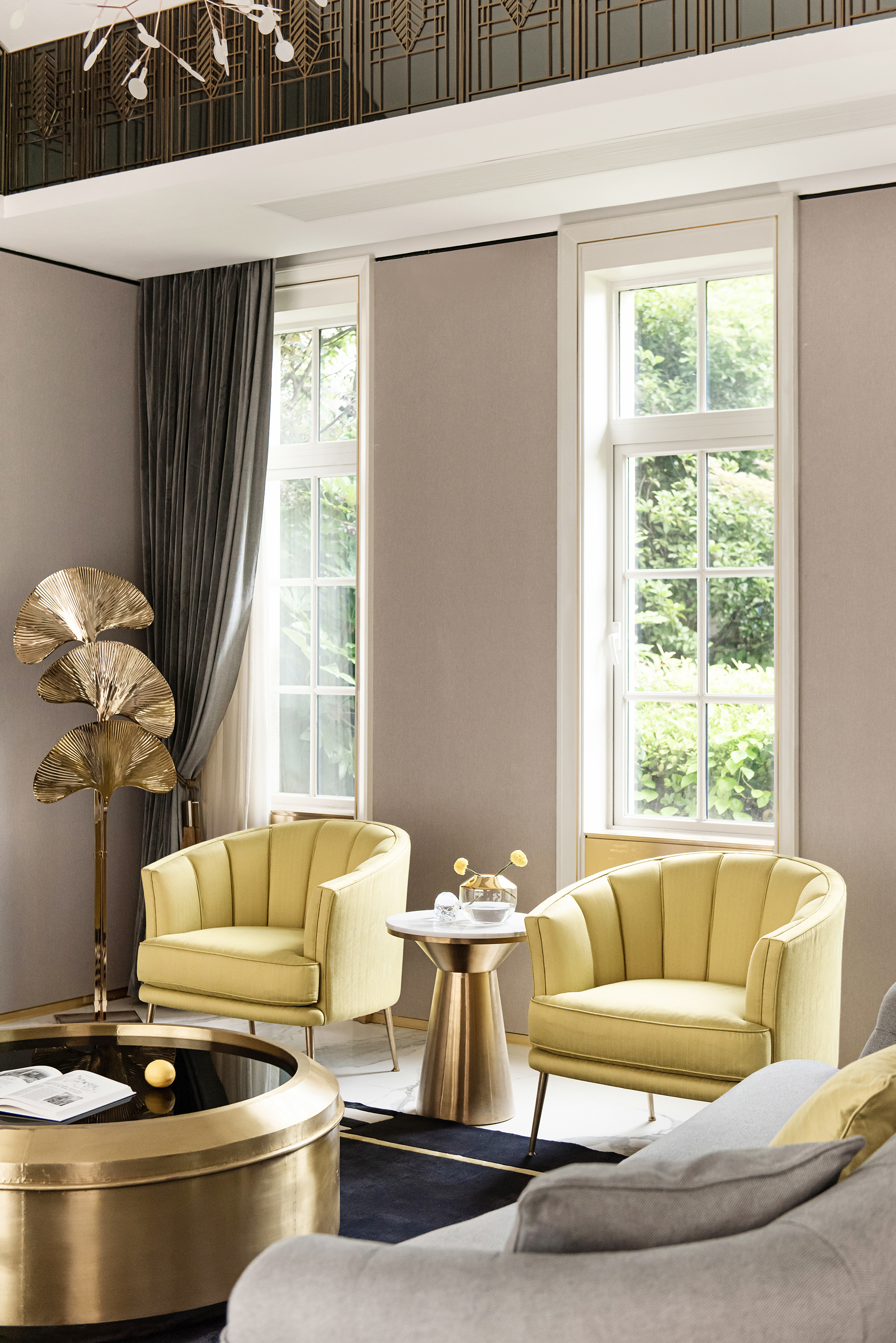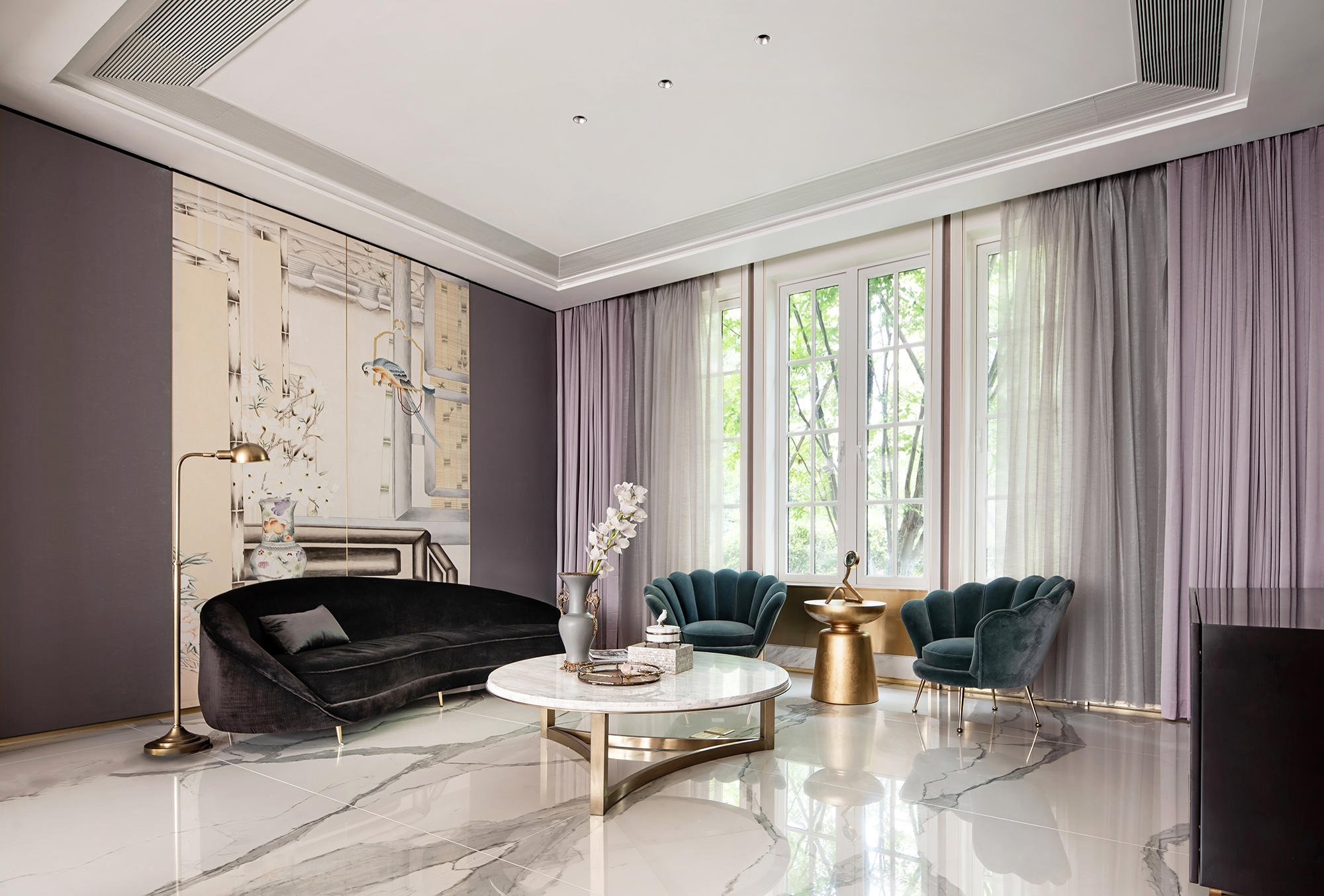 Next to the large living room is a woman's space specially designed by the designer for the hostess. The whole space exudes a sense of retro and introverted fashion. The reproduced wallpaper in the style of Giuseppe Castiglione's court is a dialogue between modern and classical elements Gray tone of the blue and purple color dialogue, through the aesthetic and ambiguous atmosphere; Suede Material Sofa and metal mix, collision of Women Lazy and noble exclusive characteristics.
