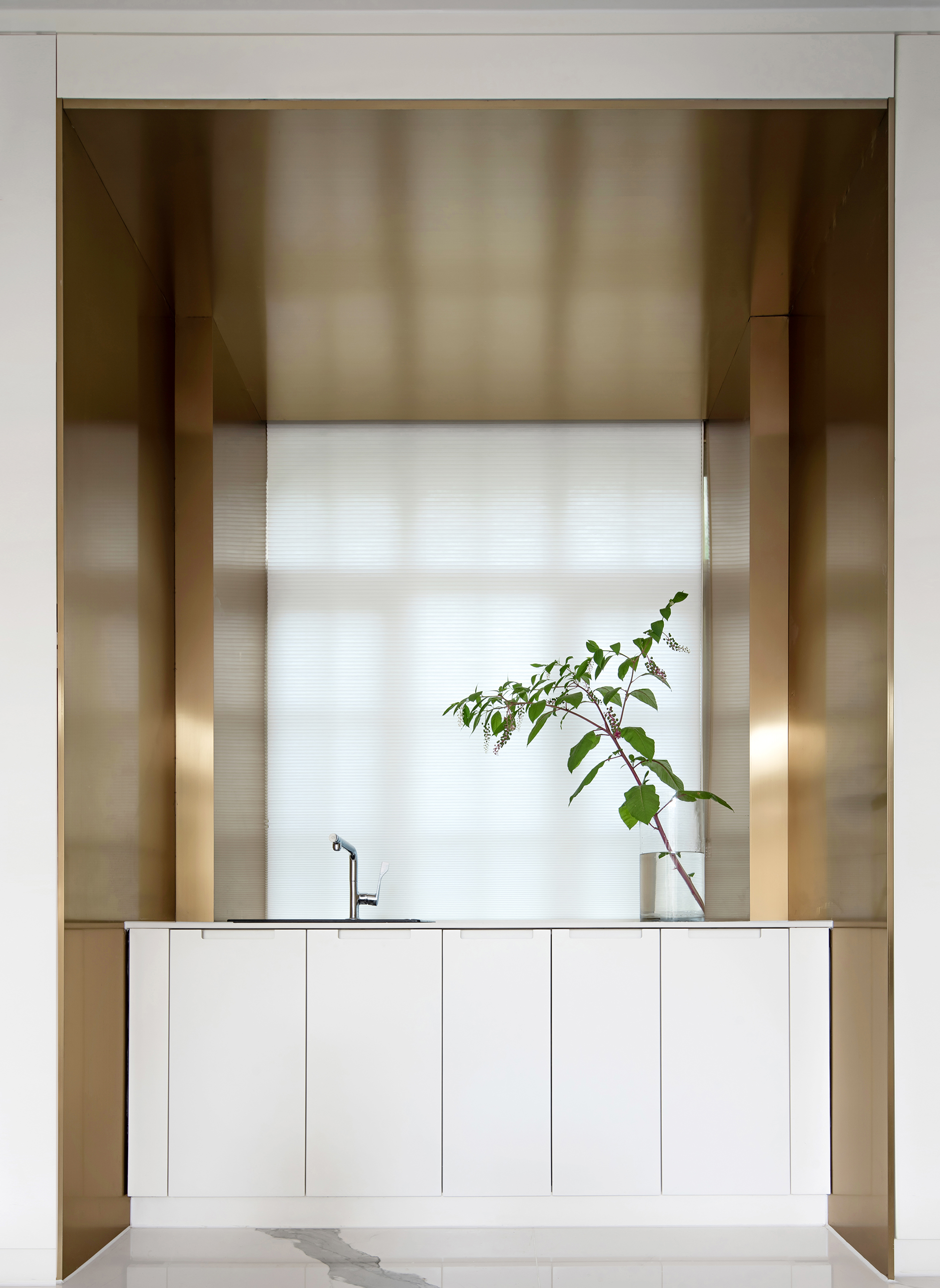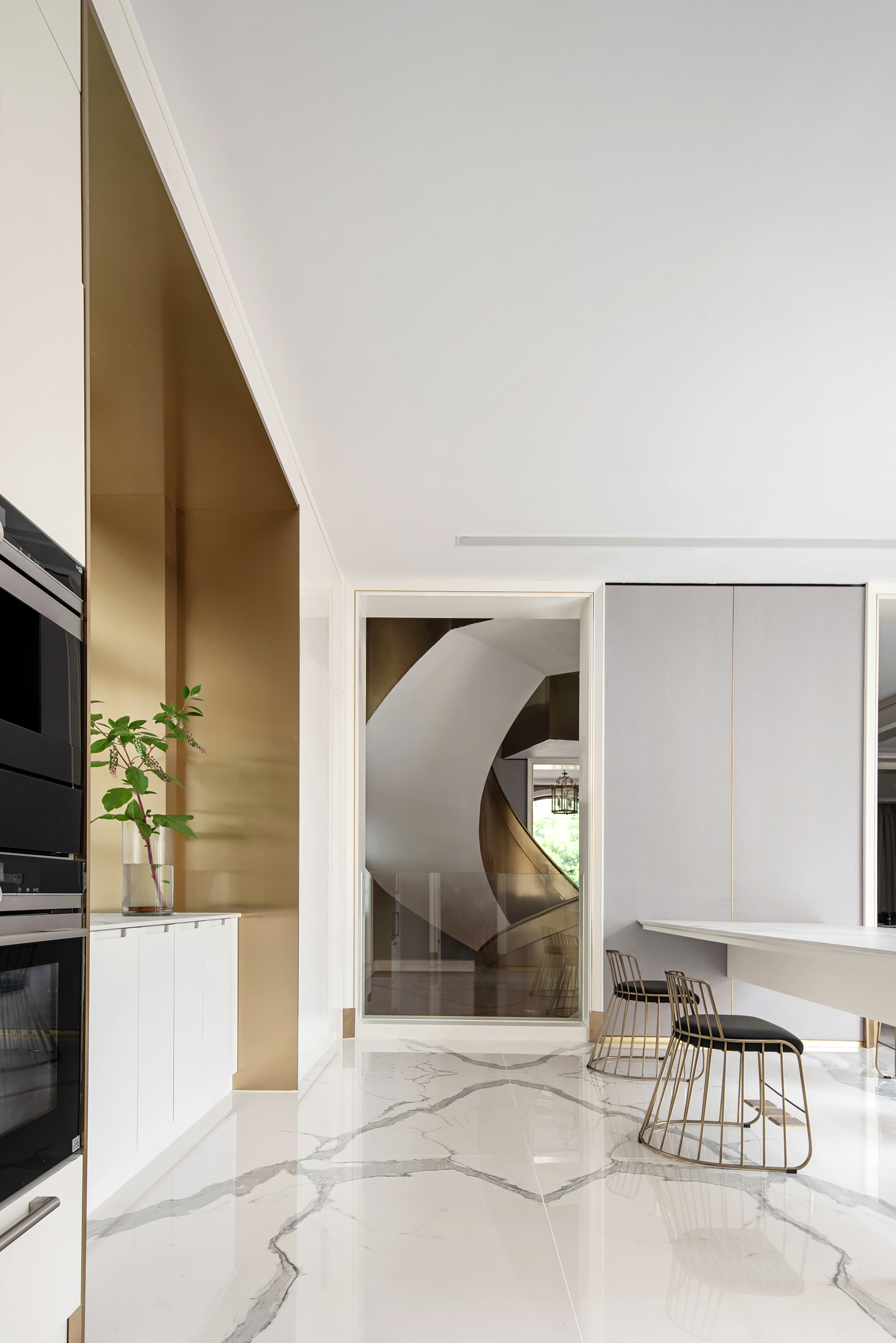 Gray and white with gold color tone, clean and neat, let a person eye bright. From the table to the ground using the most popular rock plate materials, known as the decorative materials industry "Ferrari" , large surface of the white marble texture of the rock plate and copper metal background wall with a casual touch of green, the space will have a lively life, low-key luxury, high-class feeling.
