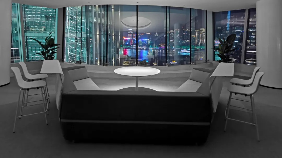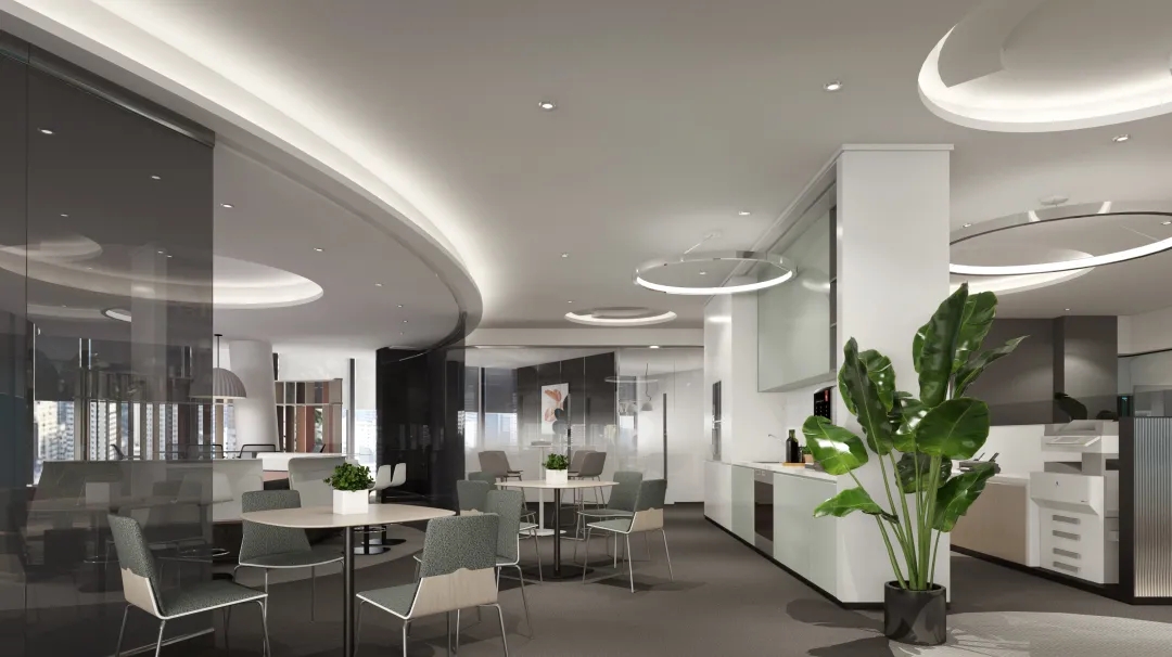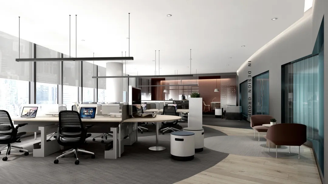 在普通办公区将员工位临窗主管靠内侧的方式,以满足最大化的采光需求,在办公模式中采用工位高低搭配,交流区穿插及休息卡座等方式打造多样可变,舒适愉快的工作环境。