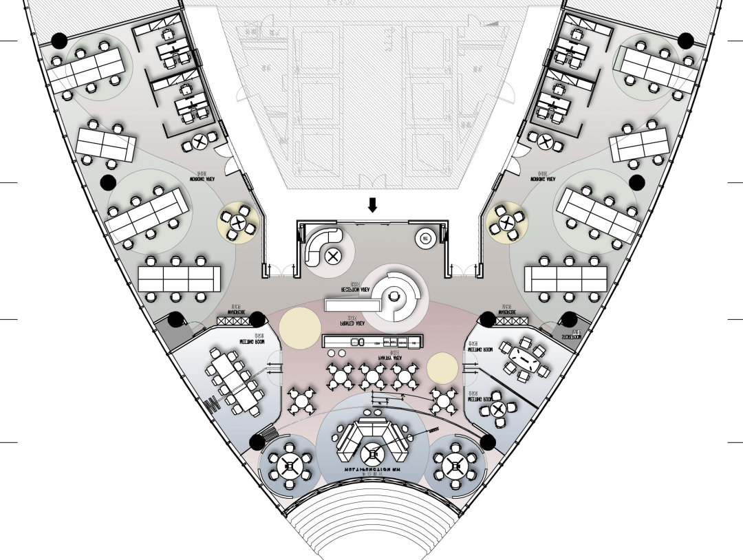 ecco办公设计中应对多元化的需求,将办公空间规划为开放式多功能区,独立会议区,及普通办公区。以动静分区的原则,将开放式多功能区及围绕布置的会议空间,放置于流线汇集点。整合了接待,茶水,文印,洽谈,会议,储藏等功能,同时通过活动隔断的开启和关闭,对空间进行整合或划分,提供包括培训,PARTY等不同的场景。
