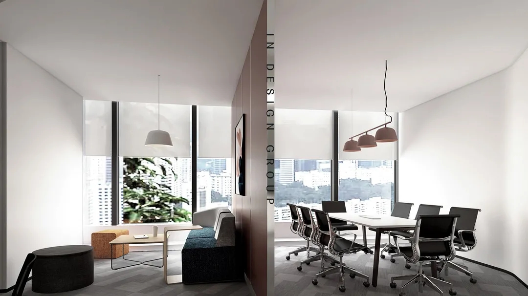 采用沙发式的会议洽谈模式,会议变得轻松有趣。东面视野开阔的两个会议室定义为轻松的感受,采用北欧的家具品牌,设计休闲会议空间。西边灵活性的会议空间,在隔断打开时,成为一个中型会议室。