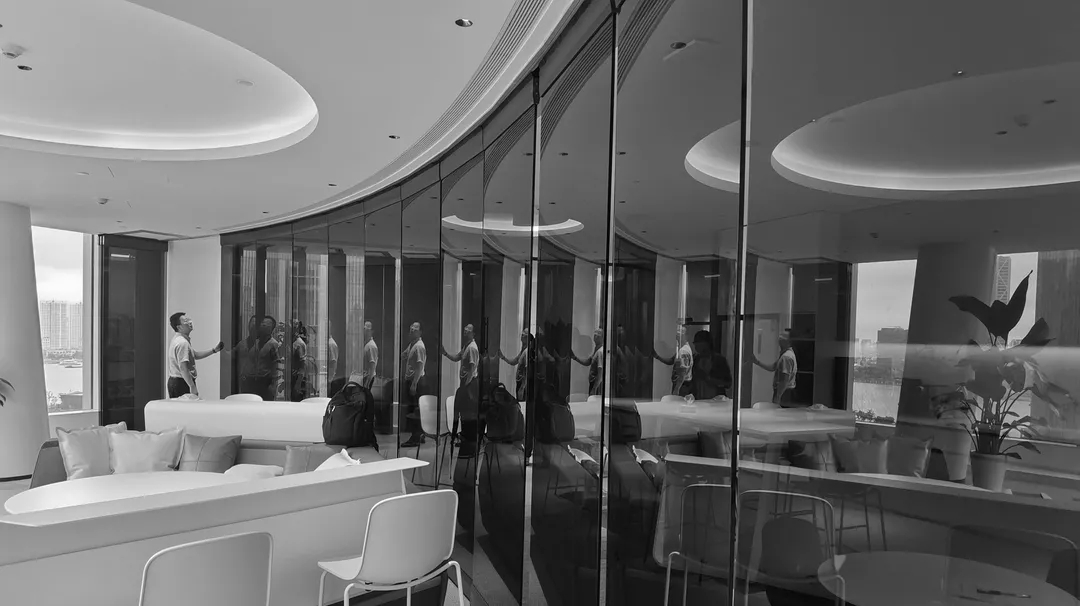 多功能区域规划,创建多元自由舒适的办公空间。区域内有独立的办公间,有头脑风暴的讨论区,有会客商议的洽谈室,亦有小型的会议室。大面的移动玻璃隔断,自由选择打开或关闭,且将茶水间与多功能厅相互隔开。视野最为开阔的空间方便不同规模的会议、活动在此展开。左右两边的洽谈室与会议室所在的隔断是采用镜面不锈钢与彩色玻璃,以及局部的ecco皮料来进行设计,通透安定,呈现给员工和外来客户一个充满自由舒适的环境。