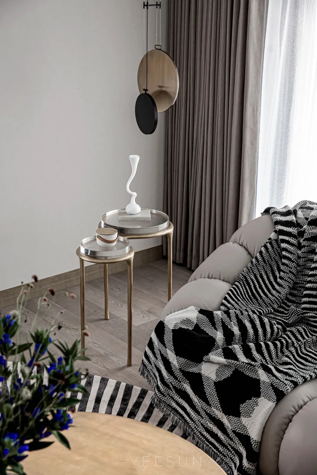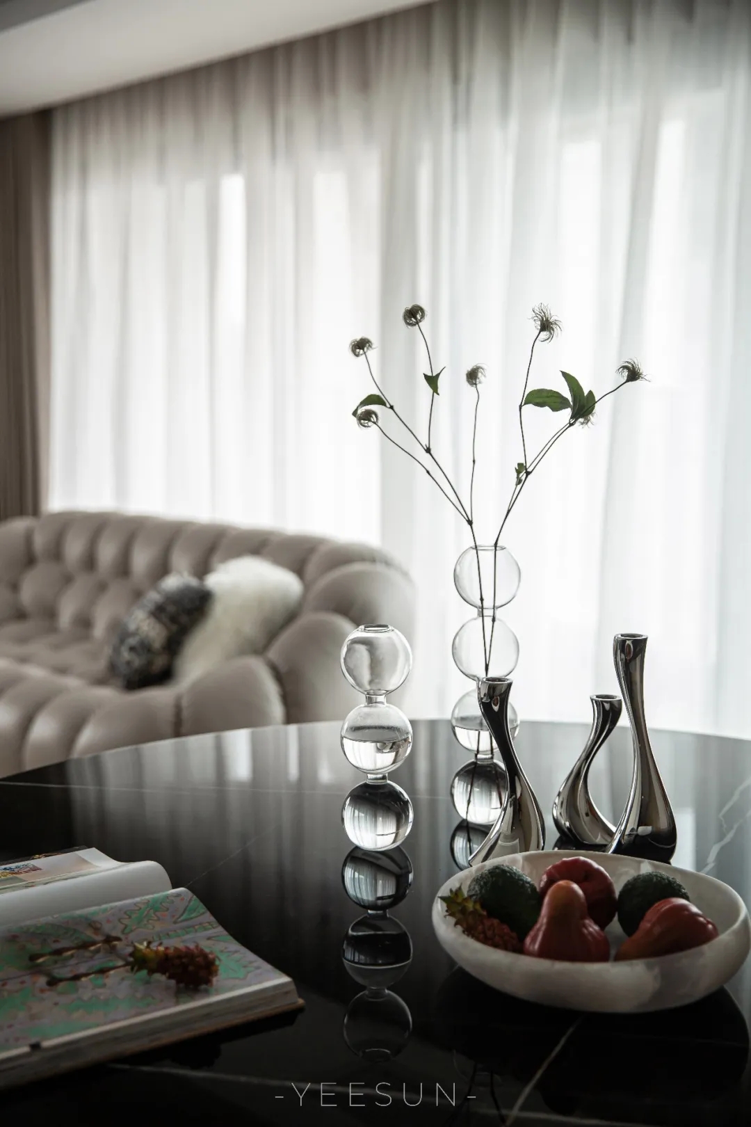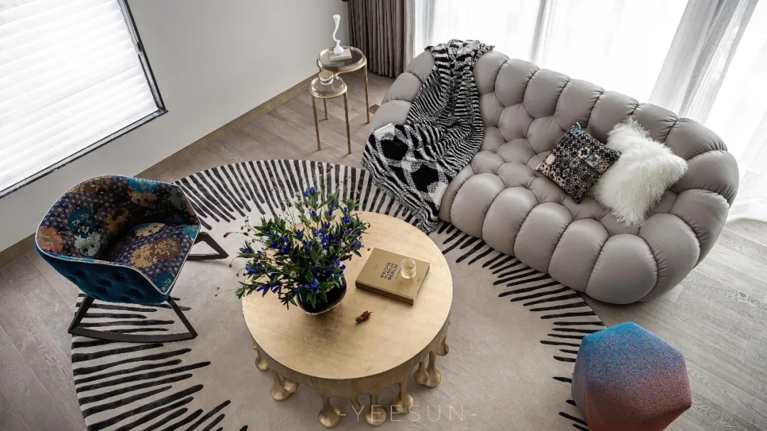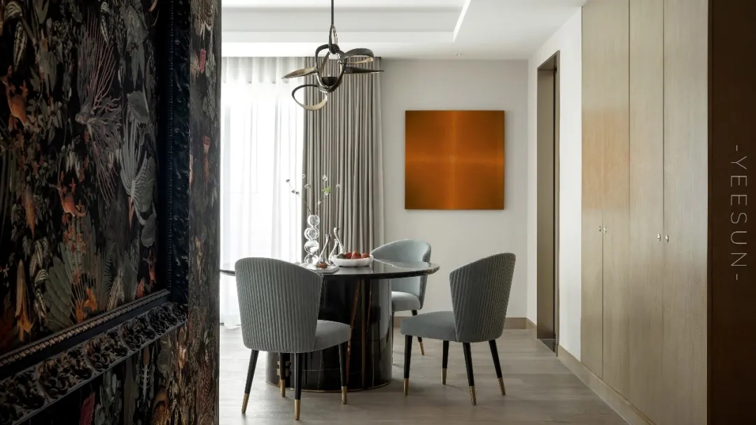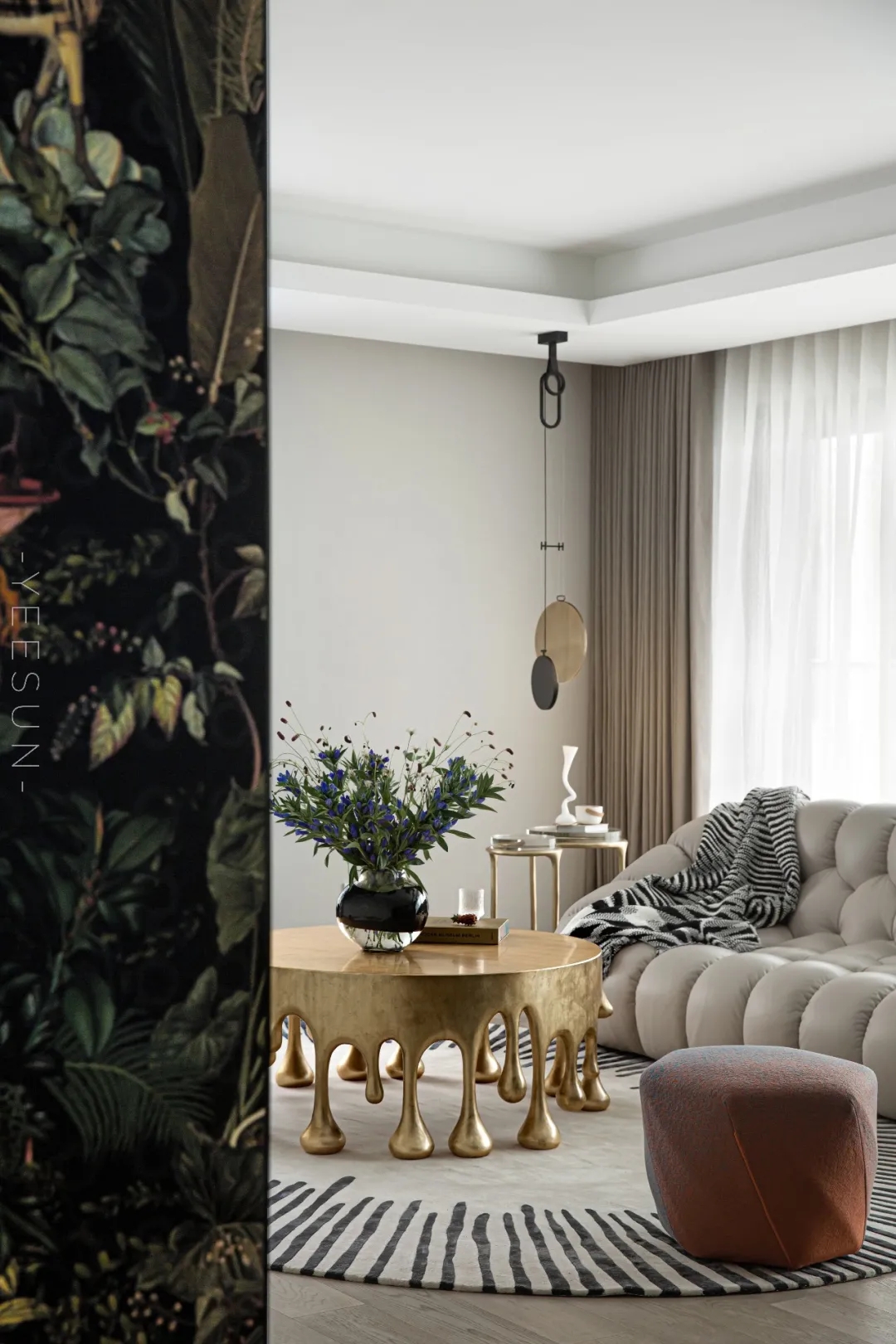 The living room area continues random and heartfelt sensory cognition. The design and transformation of no main lamp makes the space feel more open and free; the small pier of moroso has unrestrained color without losing the charming temperament of elegance; The shape of the tea table is like the overturned water flowing to the ground. It is vivid and expressive. It is made of solid wood, polished, compared and adjusted again and again, and finally sprayed with gold. It echoes with the edge table and Art Chandelier. Everything becomes more interesting, that is, smart and unique.
