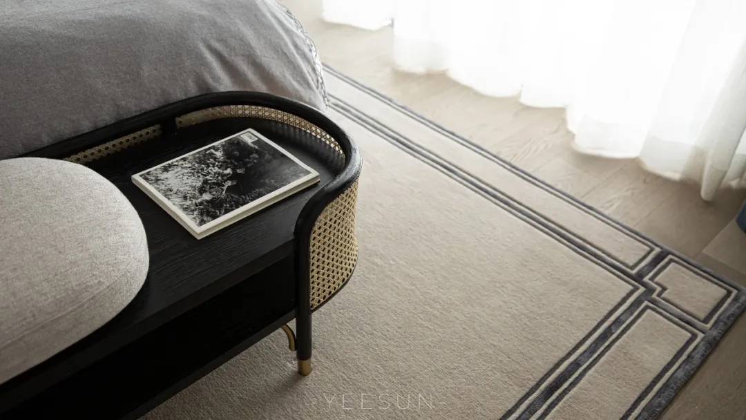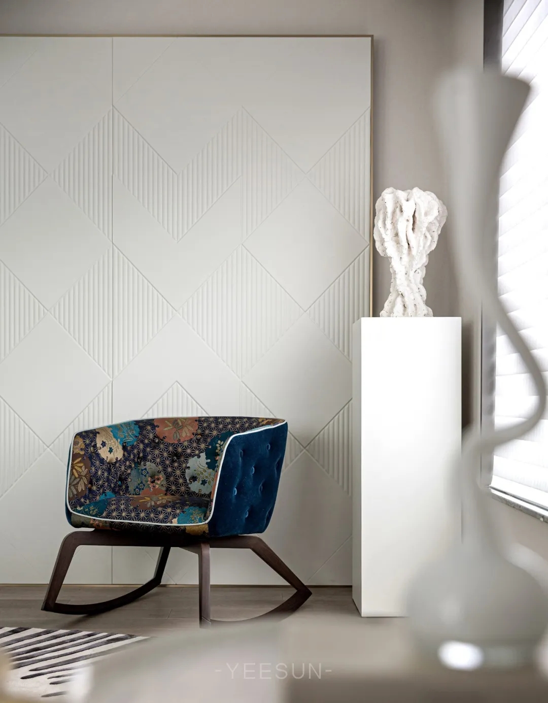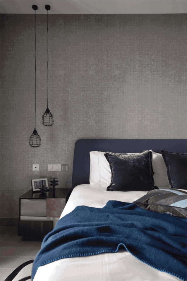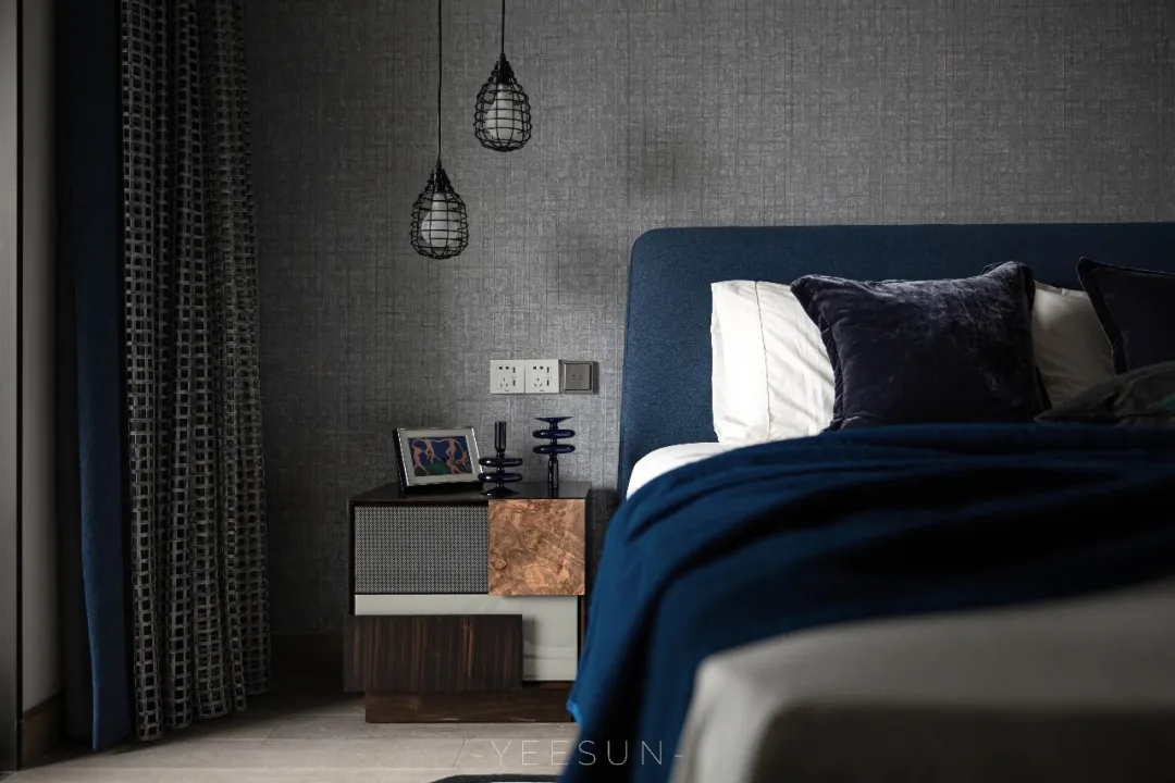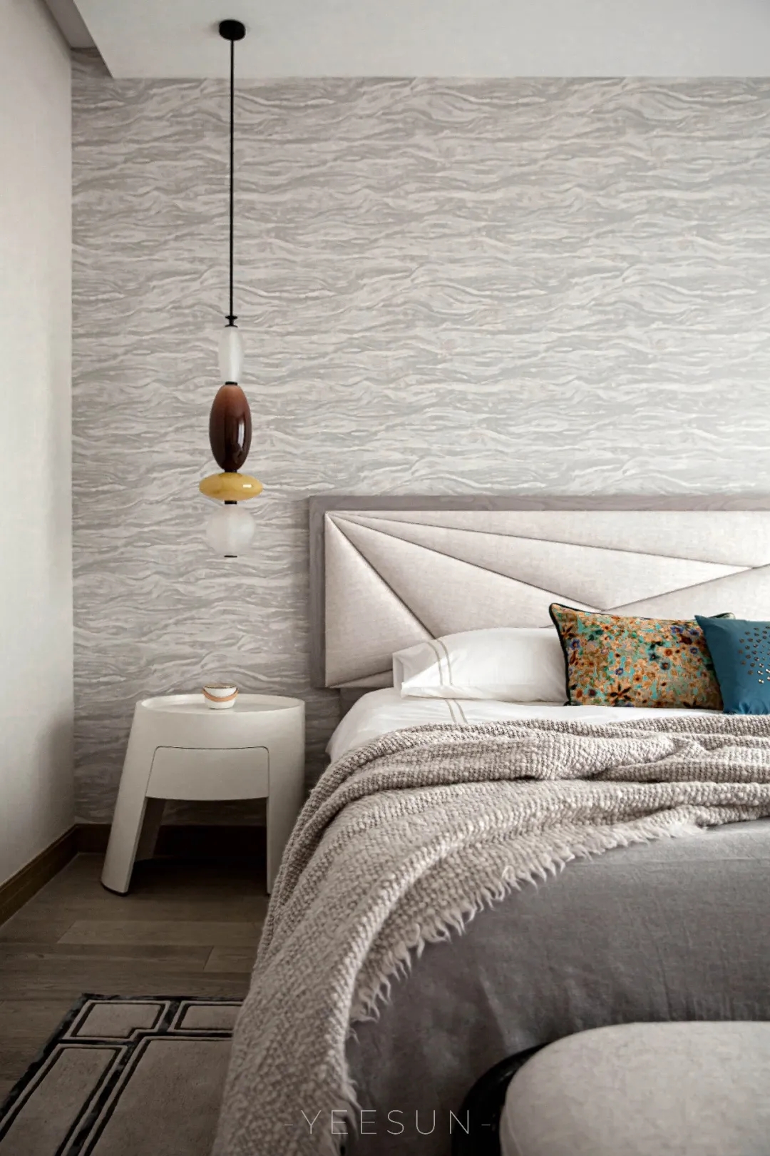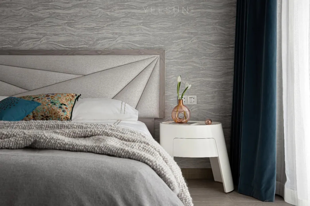 Master bedroom will be romantic water halo elements and exquisite modeling of custom furniture used in the design, low-key pattern is the designer's subtle thinking. Light color water wave pattern wallpaper, fine fabric texture of blue velvet curtain, geometric modeling of bed circumference texture, multi-dimensional interpretation of the harmonious artistic conception of "the best is like water" and the ever-changing spiritual idea, harmonizing the high-quality home experience.