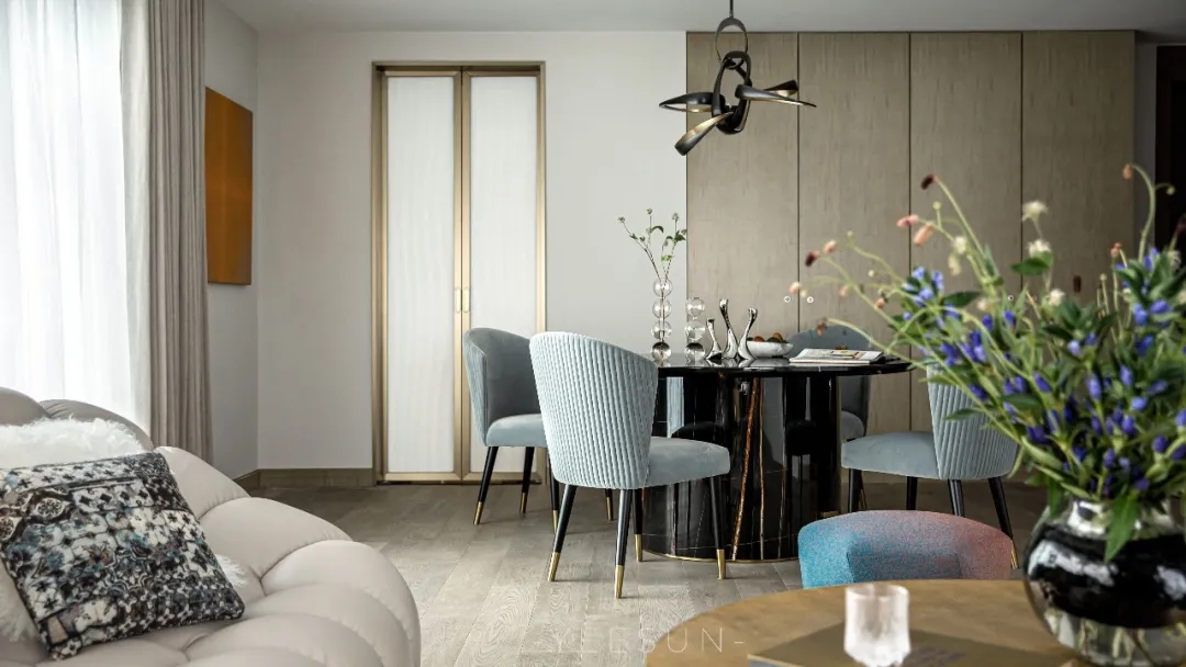 联动关系的餐厅区域,无边界的自由之境。一组水蓝色的珊瑚绒餐椅搭配劳伦斯金岩板餐桌,优雅与轻奢,造就出古典和现代两张迷人面孔,富有戏剧性的装饰方法,演绎最本质的精致生活美学。