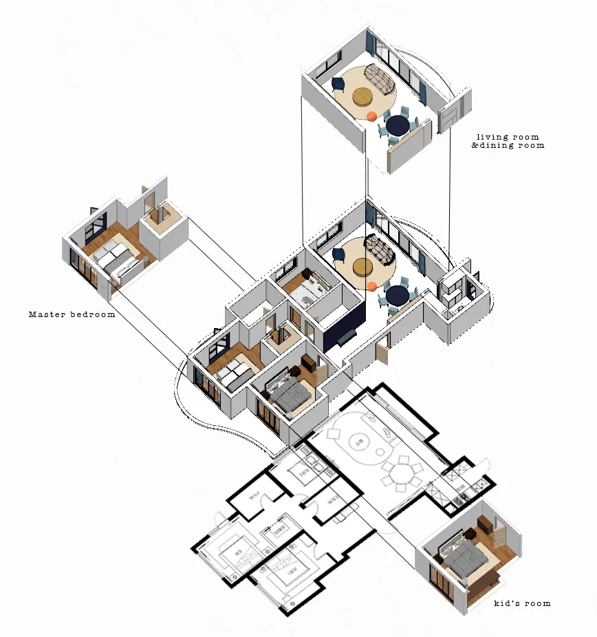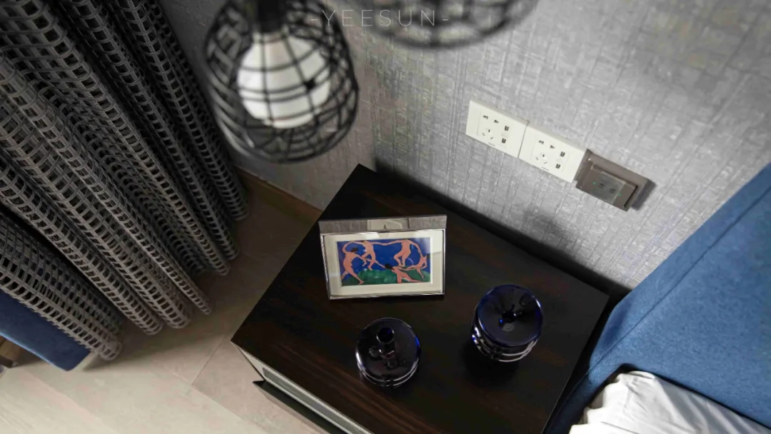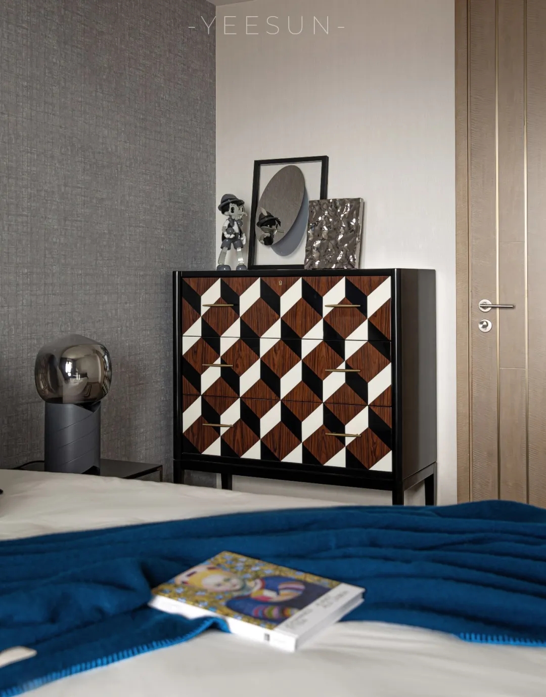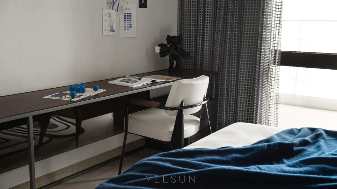 The dominant tone of the son's room is a blue spirit -- a Medieval Retro Delft Blue; a Baxter three-dimensional Geometric Mosaic Cabinet, silver water-and-light textures, vivid Kaws and designer Theodoru's limited edition classic cartoon character-pinocchio, there is like the clown spilled blue soft sphere, as if suddenly fell into a fairy tale world, time as it moves in the air freeze frame, full of fun and very eye-catching. All the artistic decoration endows the space drama tension, the body and mind stimulates the infinite imagination in the vigor nourishment.