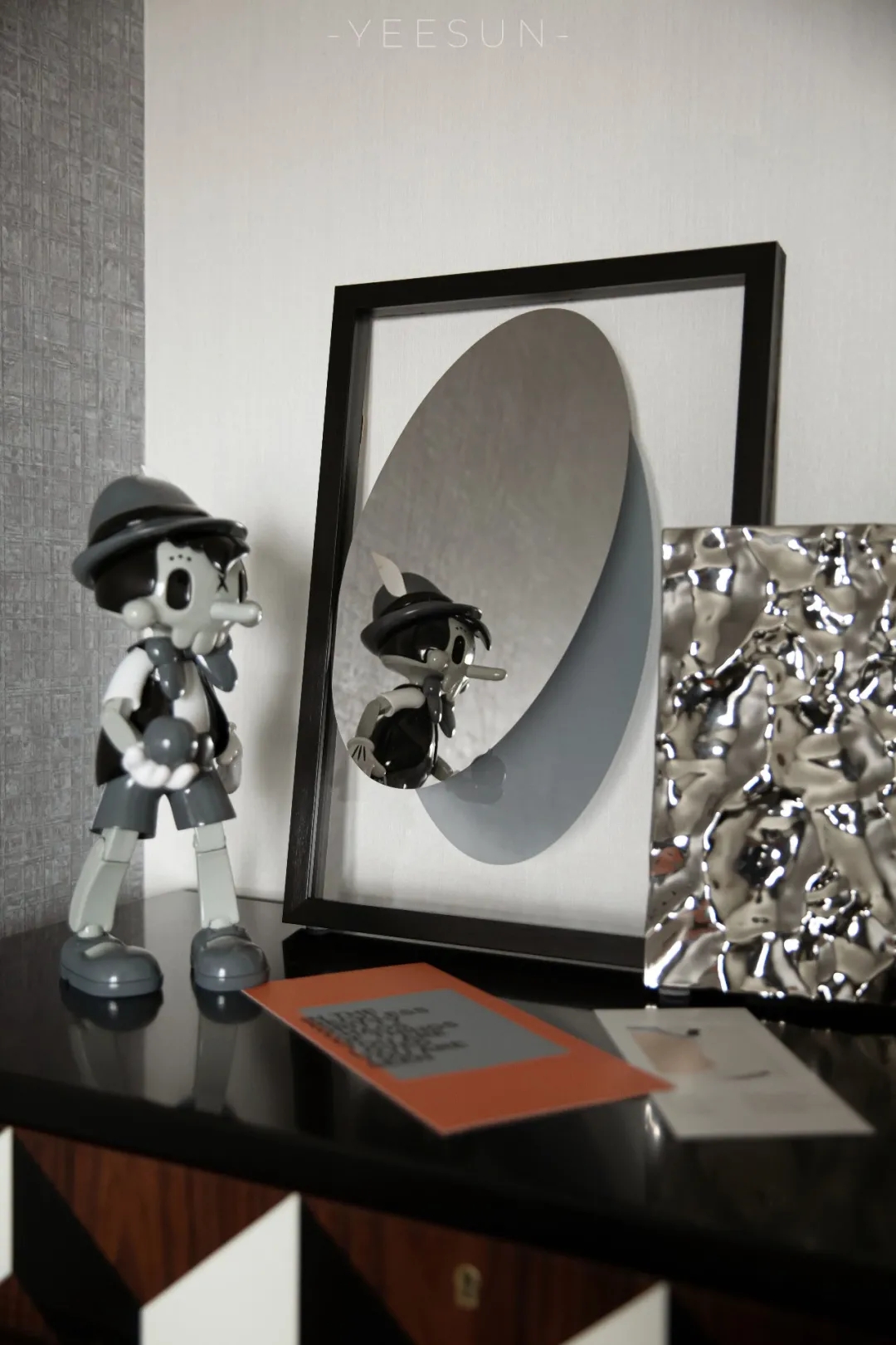 儿子房的主色调选择的是蓝色精灵---中世纪复古代尔夫特蓝;Baxter立体几何拼接柜,银色水光肌理摆件,鲜活的Kaws潮玩和设计师Theodoru的限量款经典卡通人物-匹诺曹,还有那好似被小丑洒落的蓝色柔软球体,仿若瞬间掉入了童话世界里,时间随着它的悦动在空气中定格,充满趣味又非常抓人眼球。所有的艺术装饰赋予空间戏剧张力,身心在活力的滋养中激发无穷的想象。