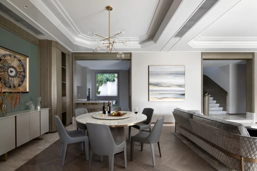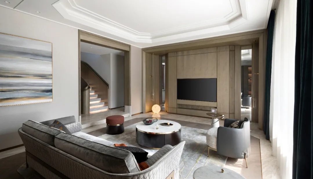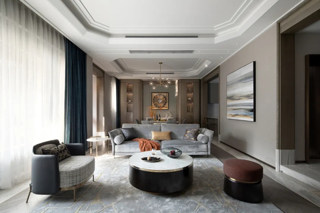 The white veil is elegant and soft. The cloth art and marble tea table add a solemn texture to the living room space. The design of the embedded TV wall uses light yellow as a compromise to publicize the beauty of layers.