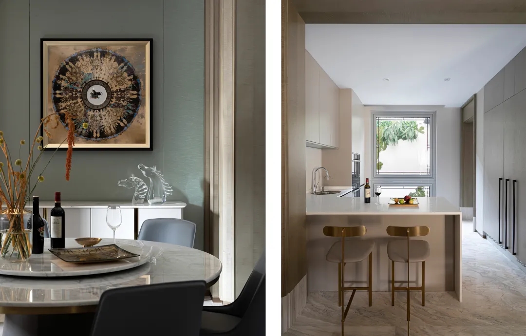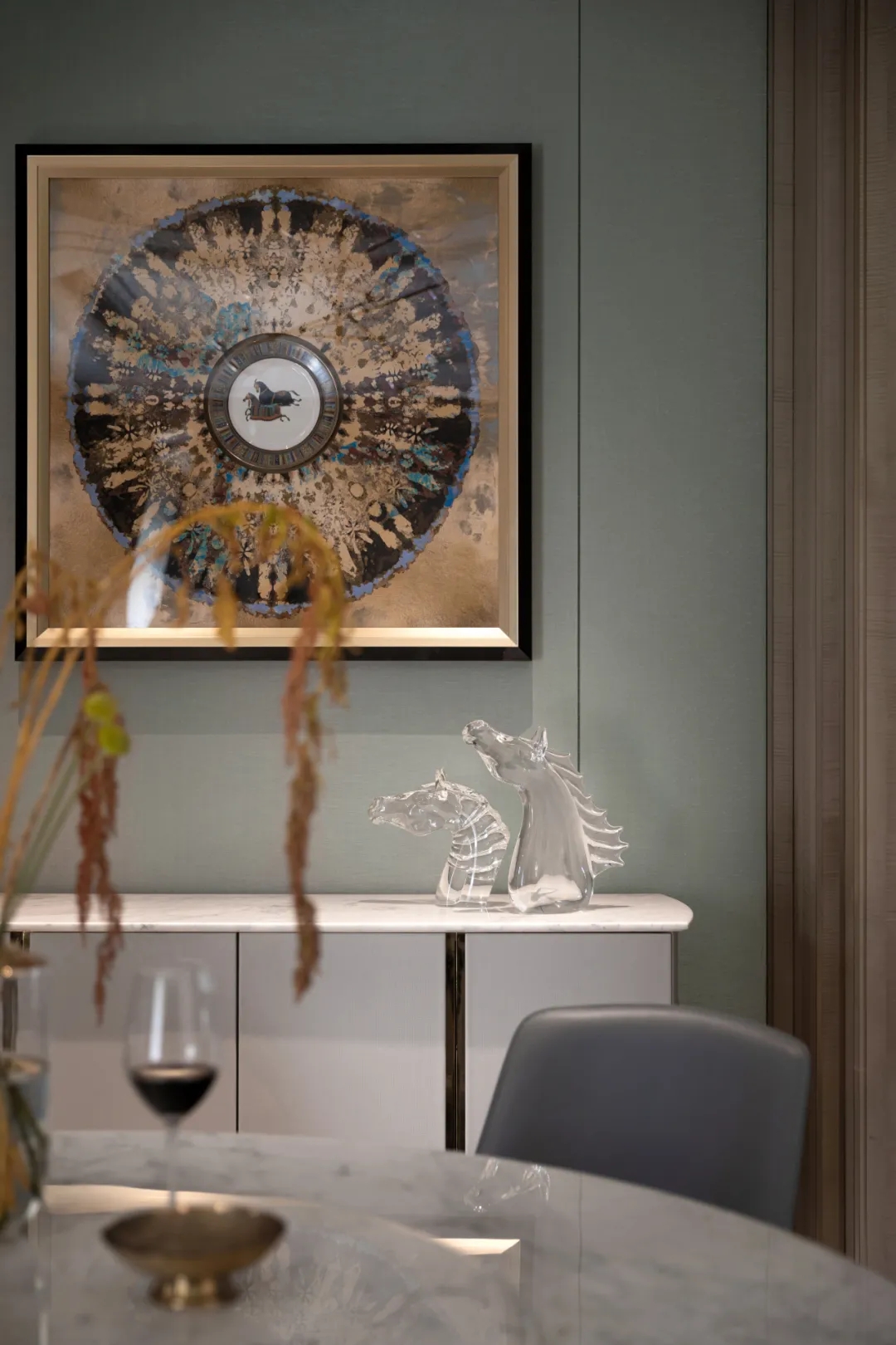 墨绿色餐厅背景墙上挂置一幅充满艺术气息的装饰画,画里两匹奔跑的骏马与置物柜上的水晶马头相得益彰,颇具灵动澄澈之美。