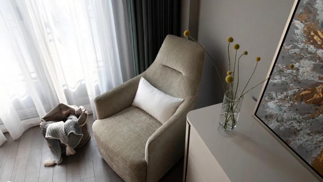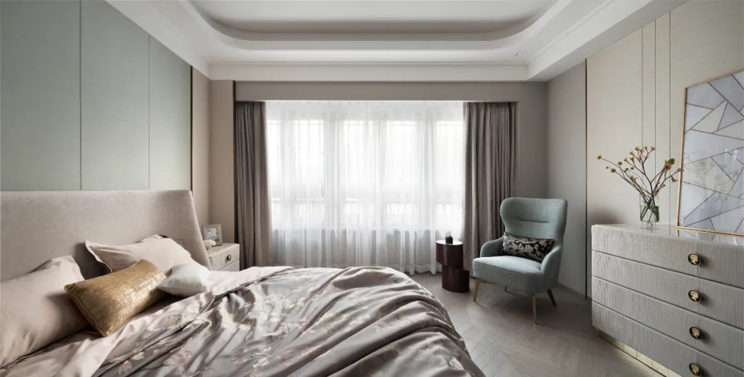 Master bedroom with light green with high degree of gray, gray green wall than the living room appears more temperature, the color of the whole bedroom with partial sex color, from the visual experience to make people calm and stable, conducive to sleep. The bedroom decoration is simple, the space atmosphere is fresh and natural.