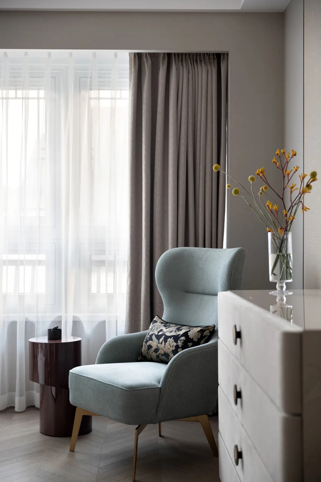 主卧以浅绿搭配高明度的灰,灰绿色的墙面比客厅显得更加有温度,整个卧室的色彩搭配偏中性色,从视觉感受上令人心静和安稳,利于入眠。卧室装饰去繁就简,空间氛围清爽自然。
