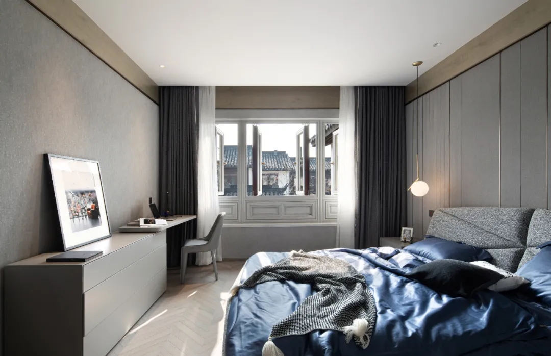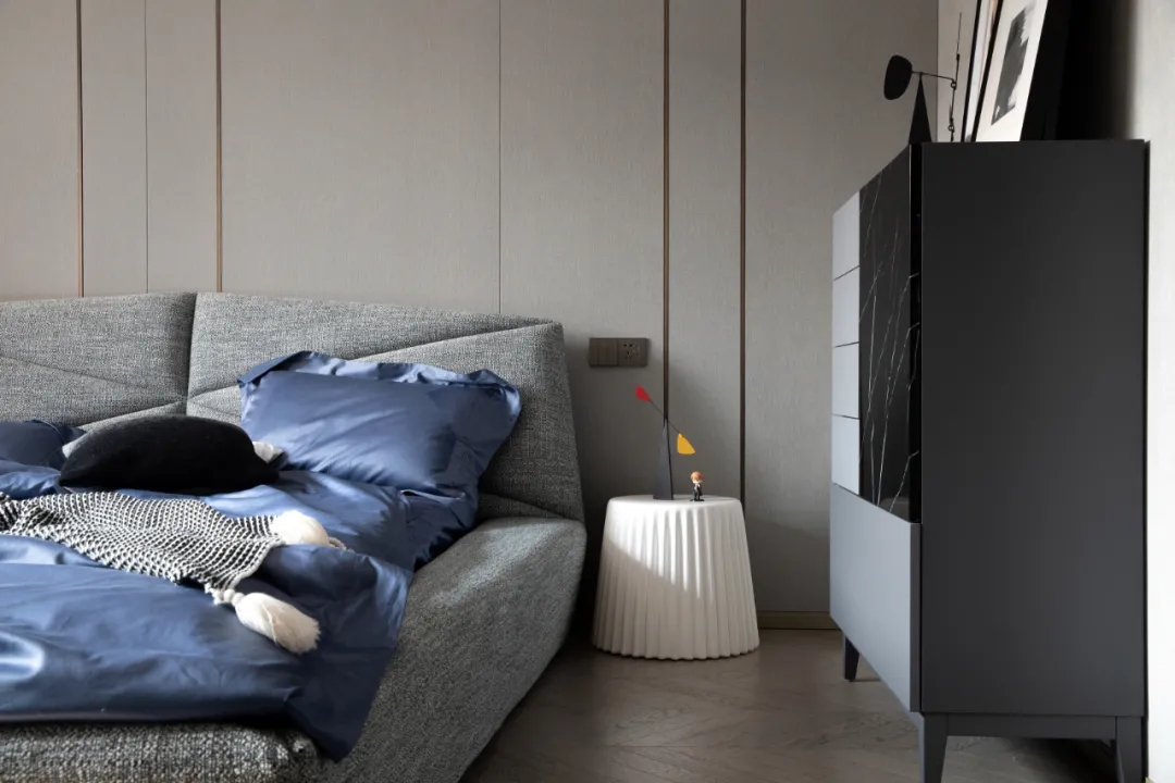 优雅的蓝色真丝慵懒的躺在床上,极简轻奢风的床头吊灯搭配几何金属线条,为空间增色的同时将艺术倾泄蔓延。摊开杂志本,静享惬意时光。