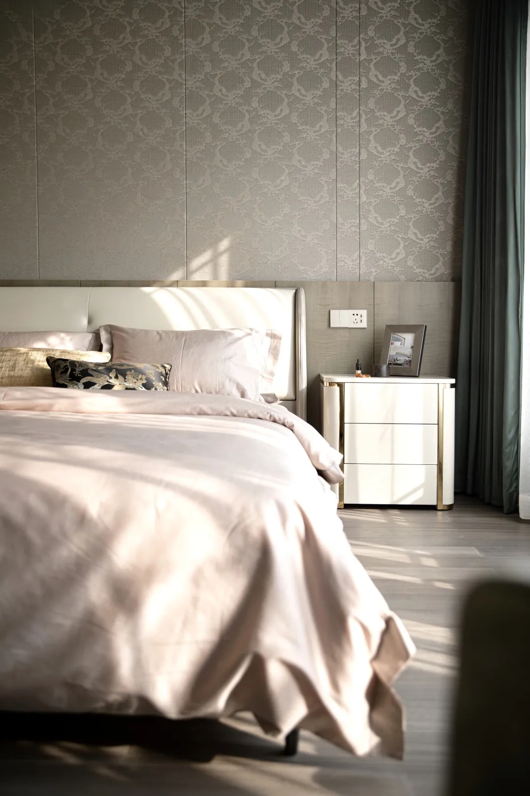 复古的花纹墙纸,奶白色的床头柜,淡粉色的精致床品,色泽搭配和谐自然,日落时分阳光洒下来,明媚温暖。