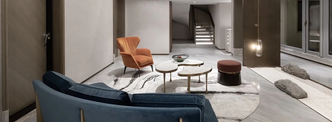 The planning of the basement space presents a simple and neat style, with a large area of milky white to lay out a leisurely and elegant space. The orange and dark blue sofas are another wonderful finishing touch.