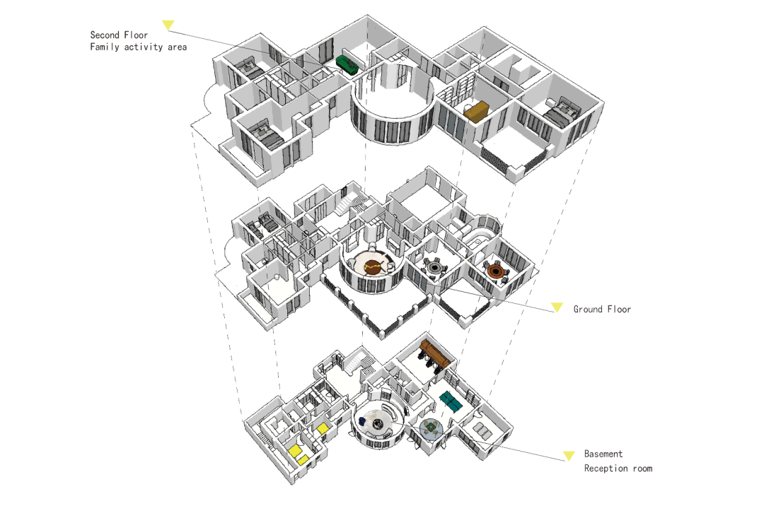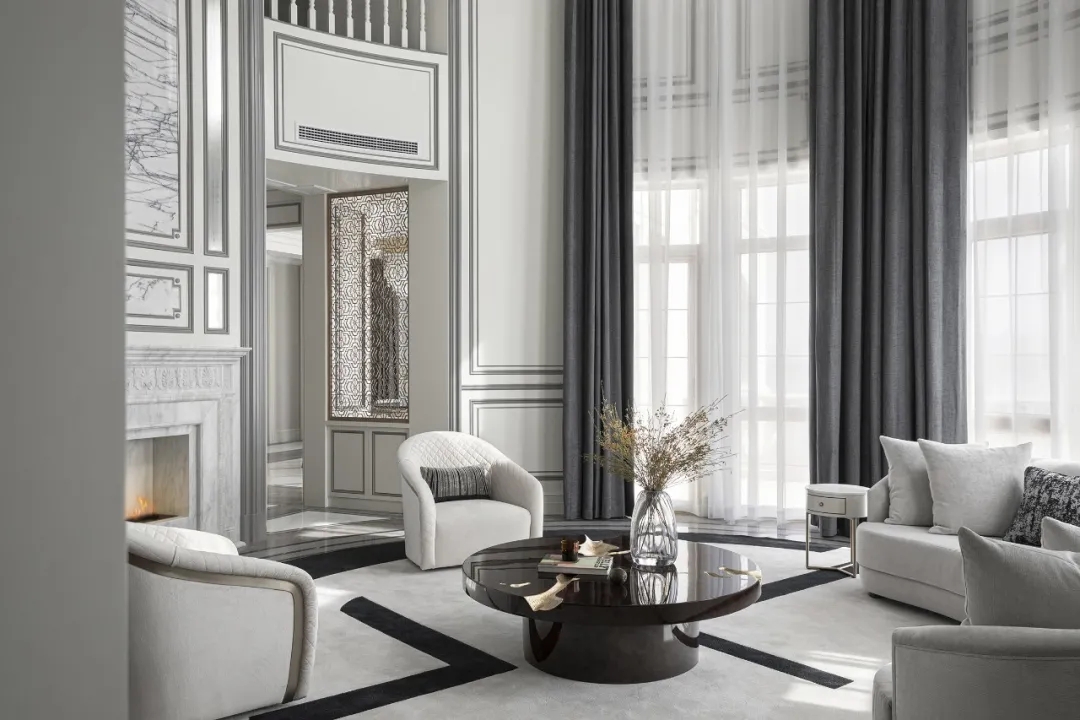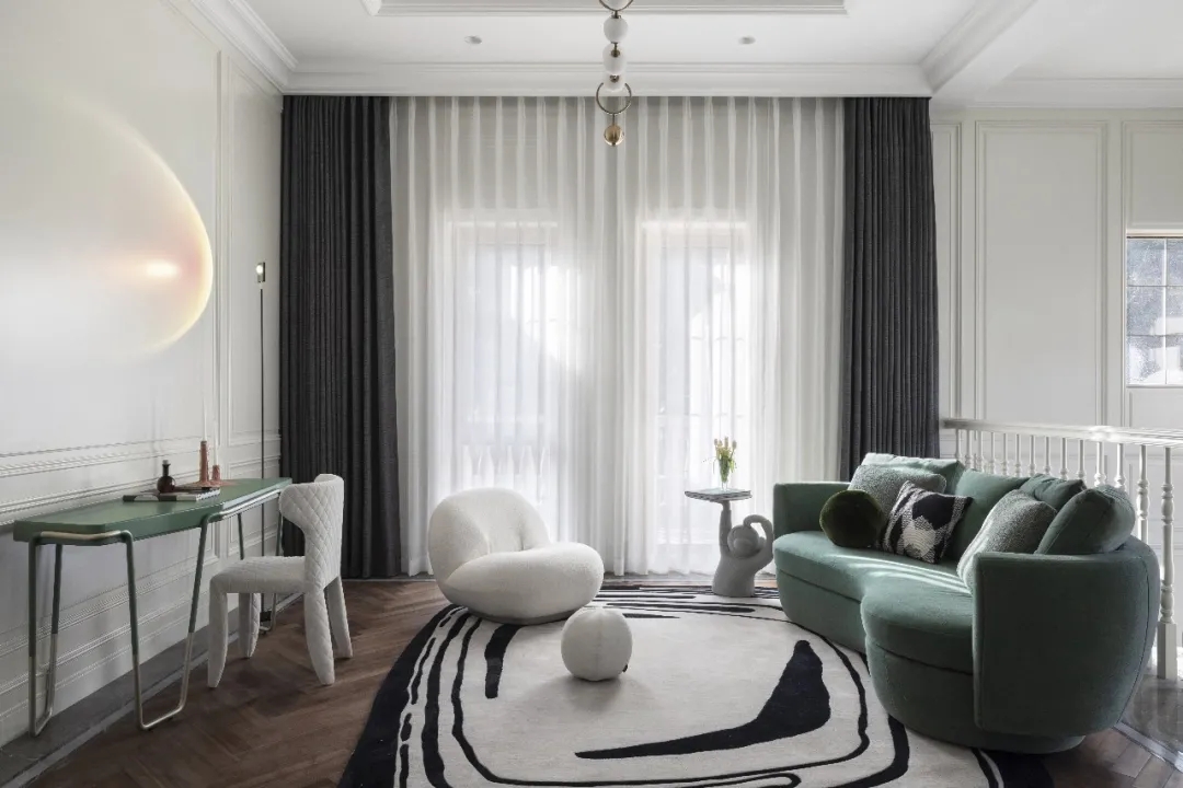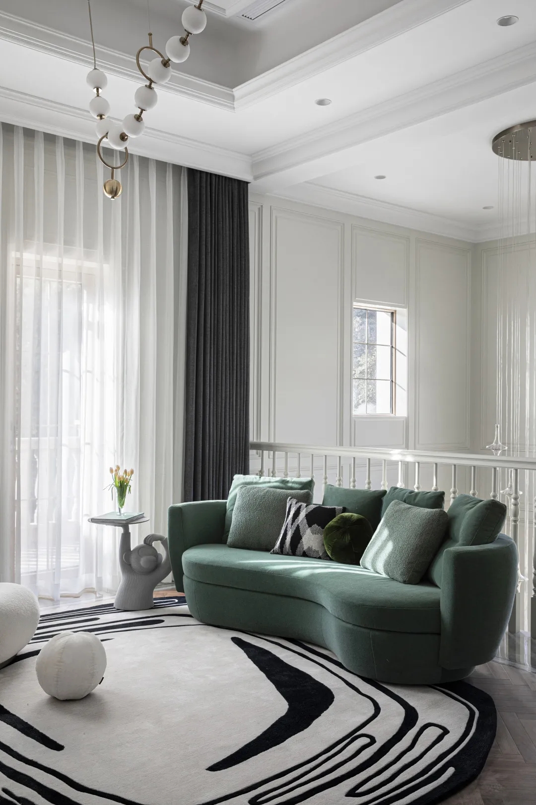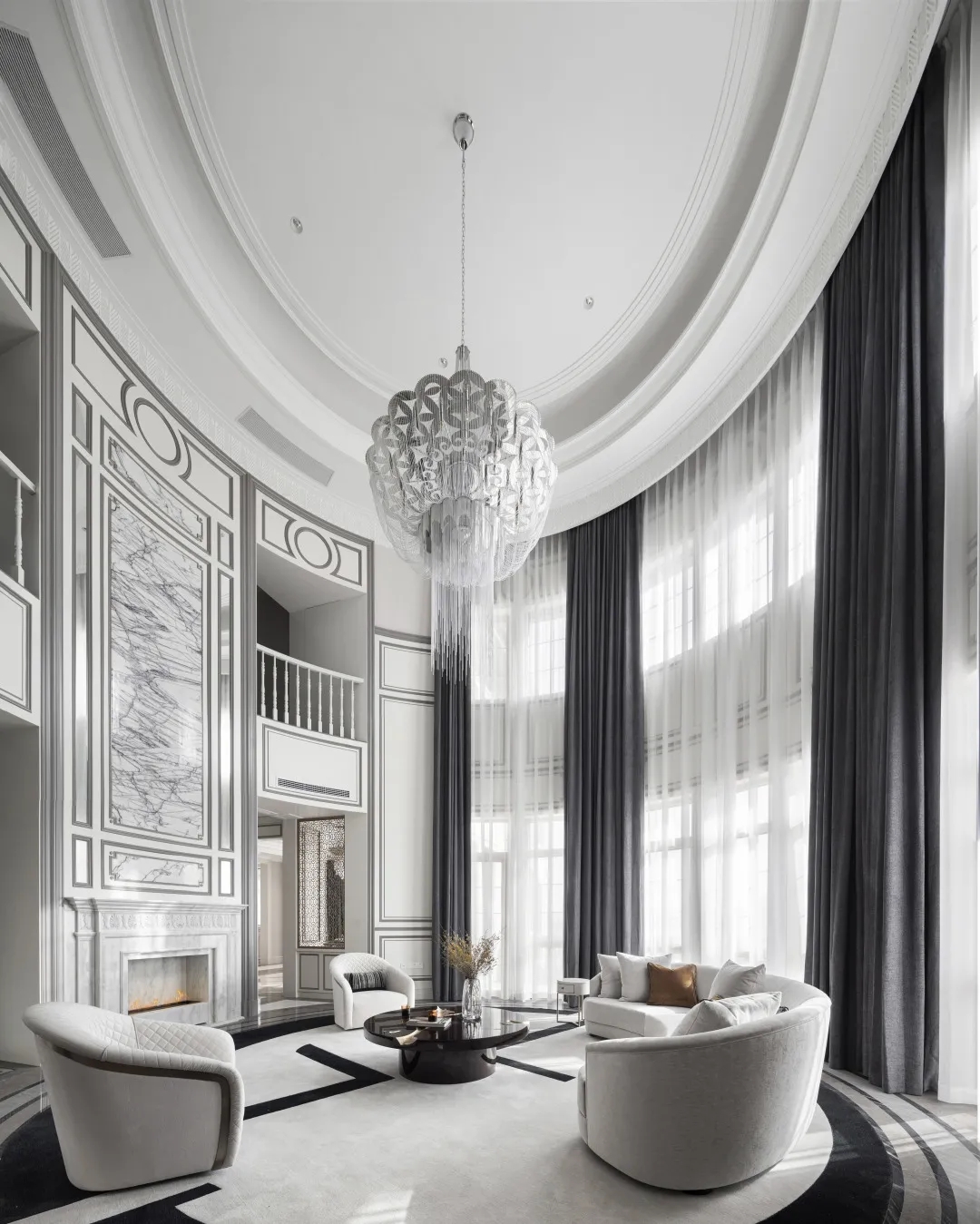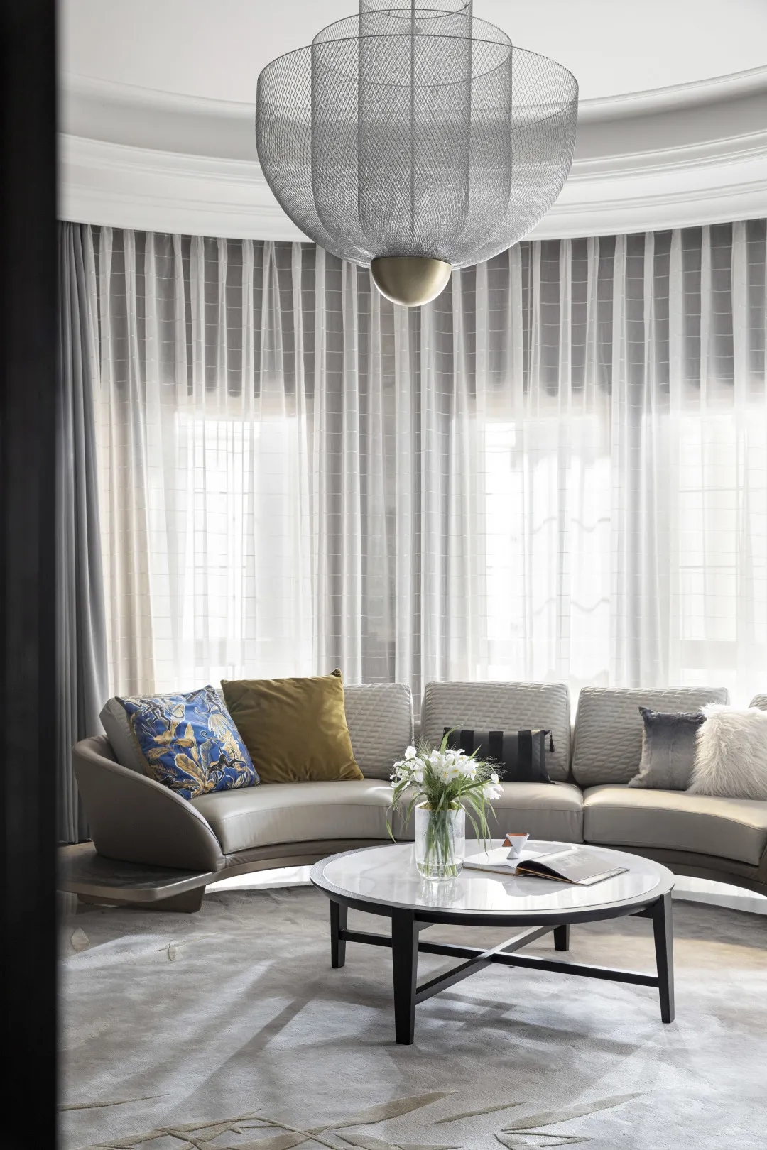 高挑明亮的圆形客厅,洞达四周,目光所及皆为欢喜。白色纱幔如瀑布般垂直而下,干净清澈。白色的弧形沙发搭配圆形茶几,韵味灵动,协调空间。