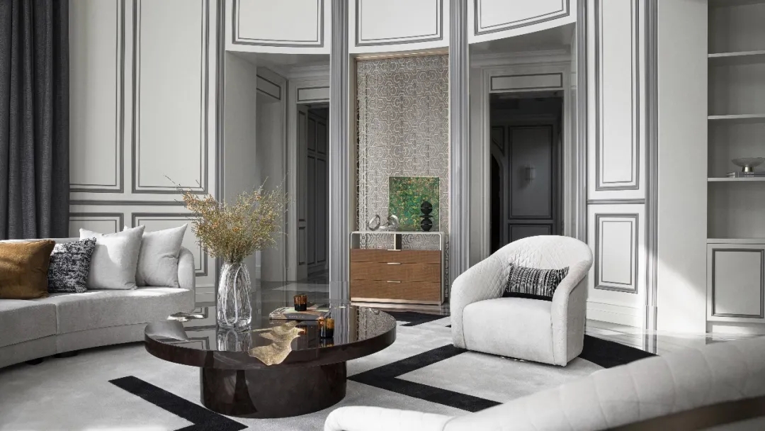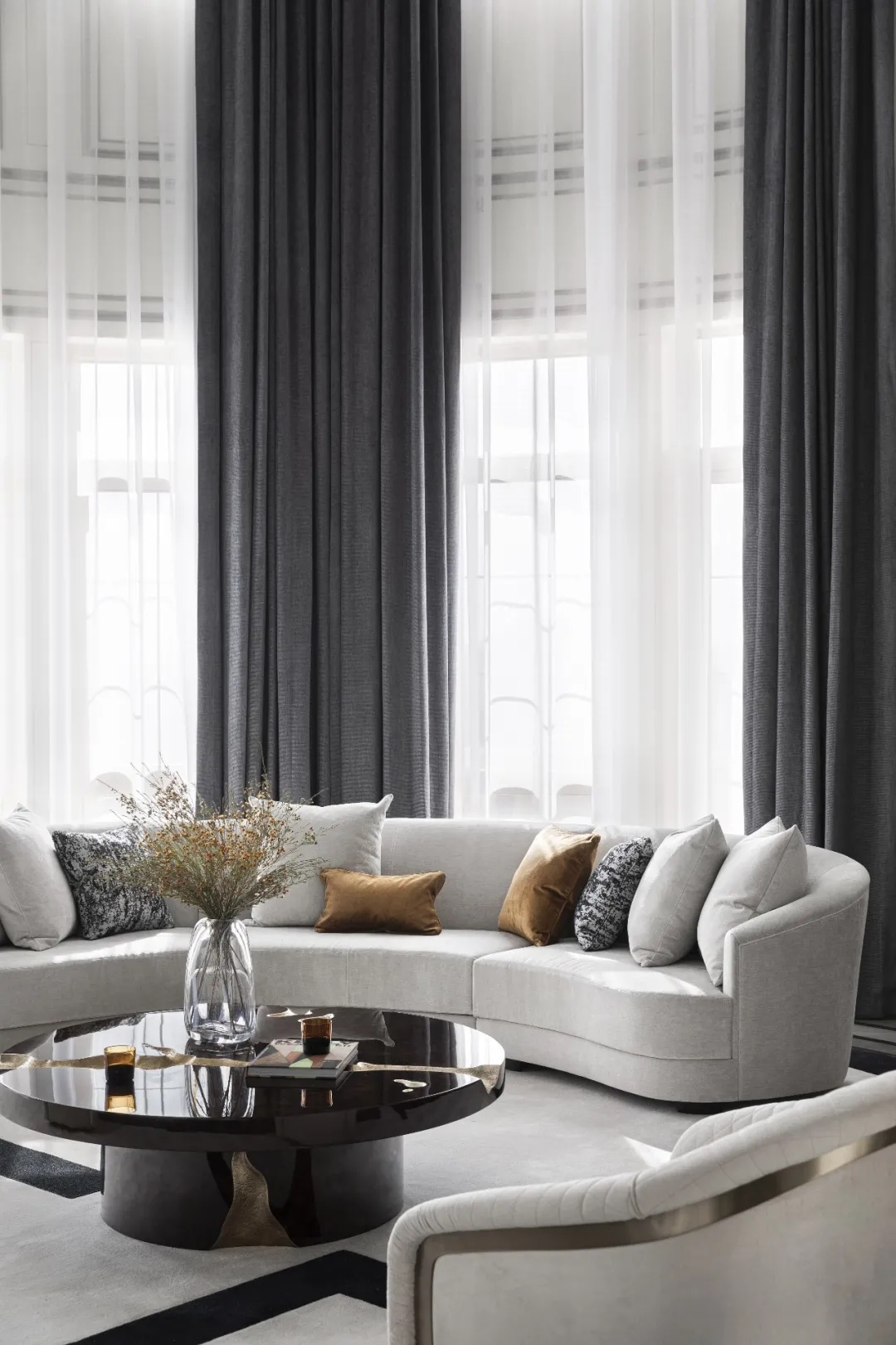 The tall and bright circular living room, which is all around, is full of joy. The white veil falls down like a waterfall, clean and clear. White arc sofa with round coffee table, charm smart, coordinated space.
