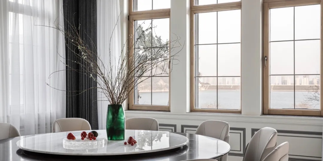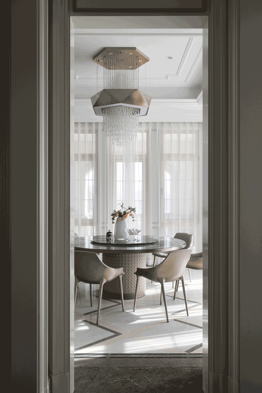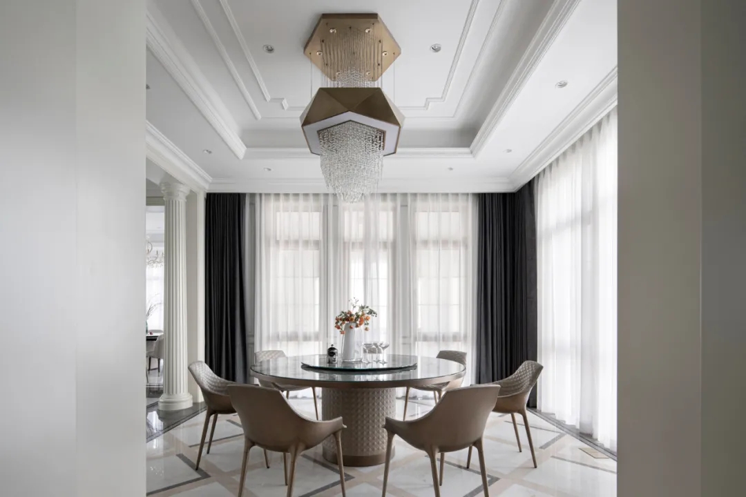 The dining room continues the theme color of the living room, elegant and peaceful, with fashionable metal chandeliers. The whole space is quiet and of high quality, exquisite and romantic. Chinese restaurants, with traditional charm of things, let the context of traditional art heritage with Chinese characteristics design style.