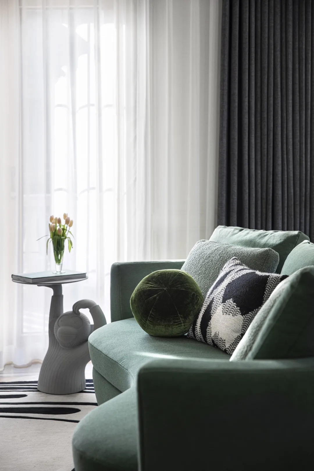 休闲厅以柔和绿色+纯净白色带来令人沉醉的舒适感,趣味的卡通角几增添几分俏皮感,活跃了整个空间的氛围。特色的夕阳灯实现了光与影的互动,让无形的光以最浪漫的艺术形态呈现——晚风轻踩着云朵,夕阳折射出的橙色与温柔。