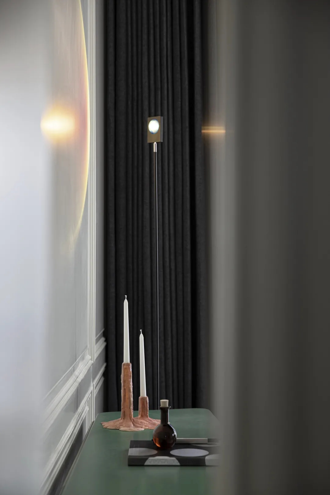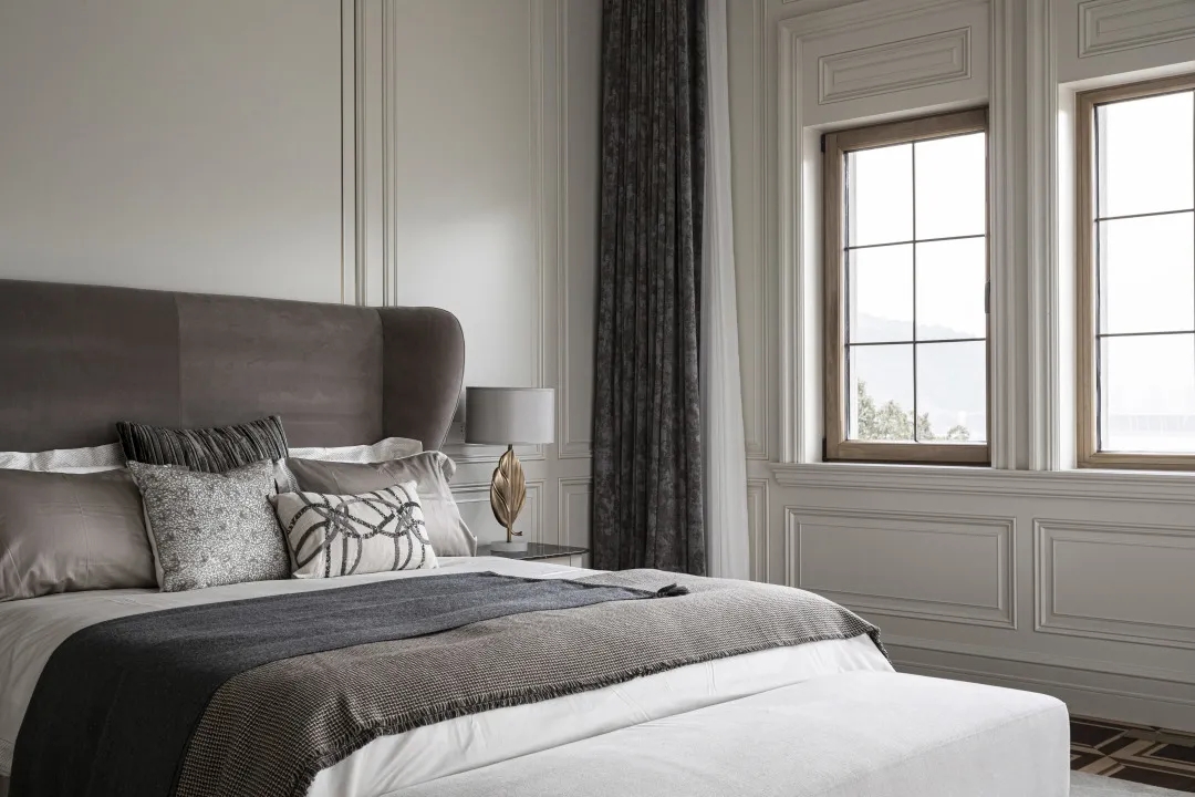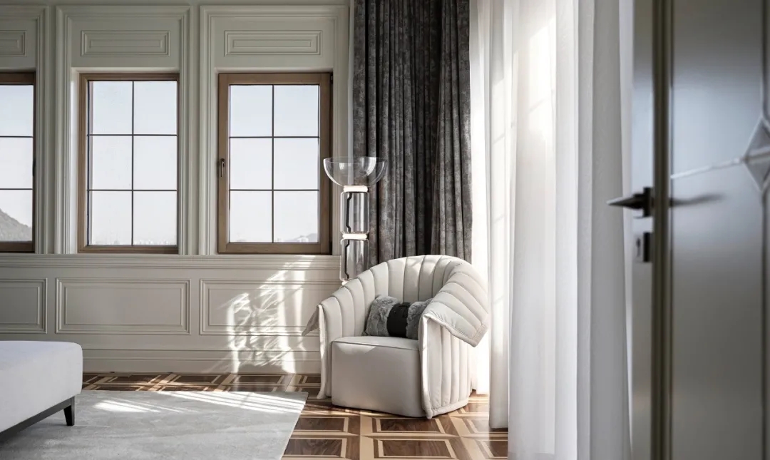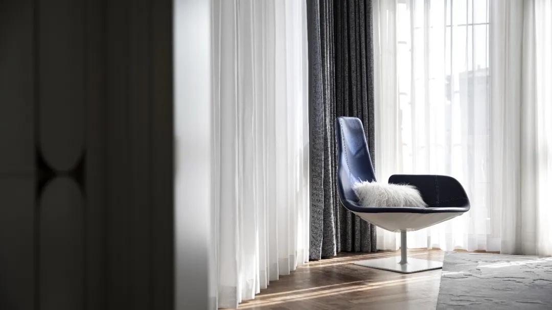 奶白色的单人沙发悠闲十足,艺术气息浓厚的玻璃落地灯细腻饱满,弥漫的灯光与清晨的第一缕阳光相遇,家居与自然的协同,美梦中的人儿被温柔的唤醒,褪去昨日的疲惫,以饱满的精神迎接新的一天。