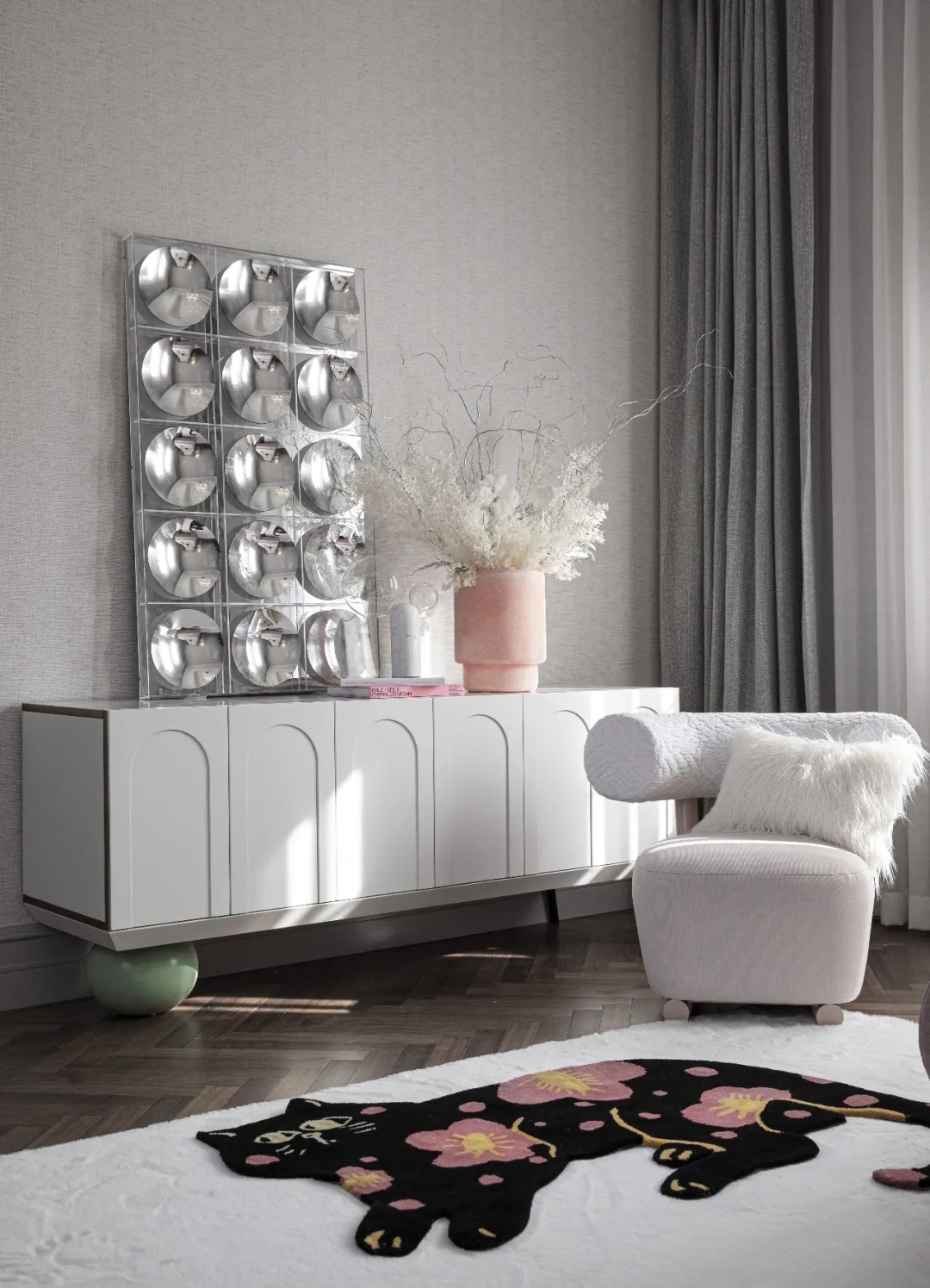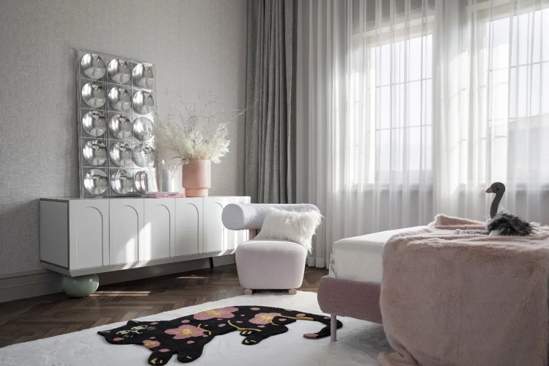粉色充满甜美、温柔与纯真。宝宝房的色彩并未追求明快而强烈的饱和色,延续整体的奶白色调,以适当的灰粉点缀,很有温暖自然的感觉,不会觉得压迫,也不会有视觉上的冲击感,完全符合儿童的纯真性格和美好幻想。清新童趣的卡通猫咪地毯、软糯舒适的白色儿童沙发、云朵般的粉色盖毯……彻底点燃一颗澎湃的少女心。
